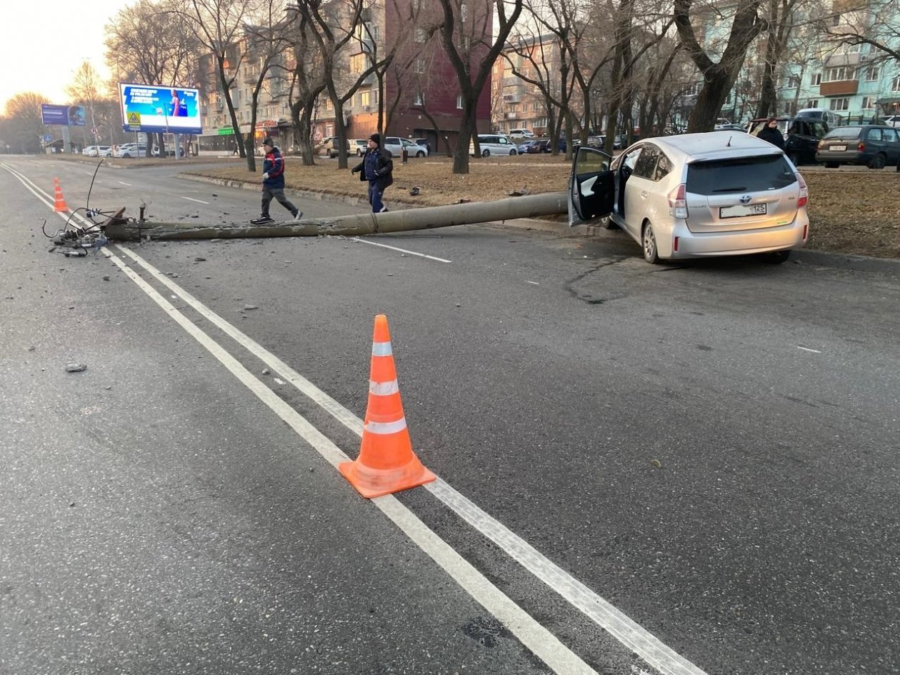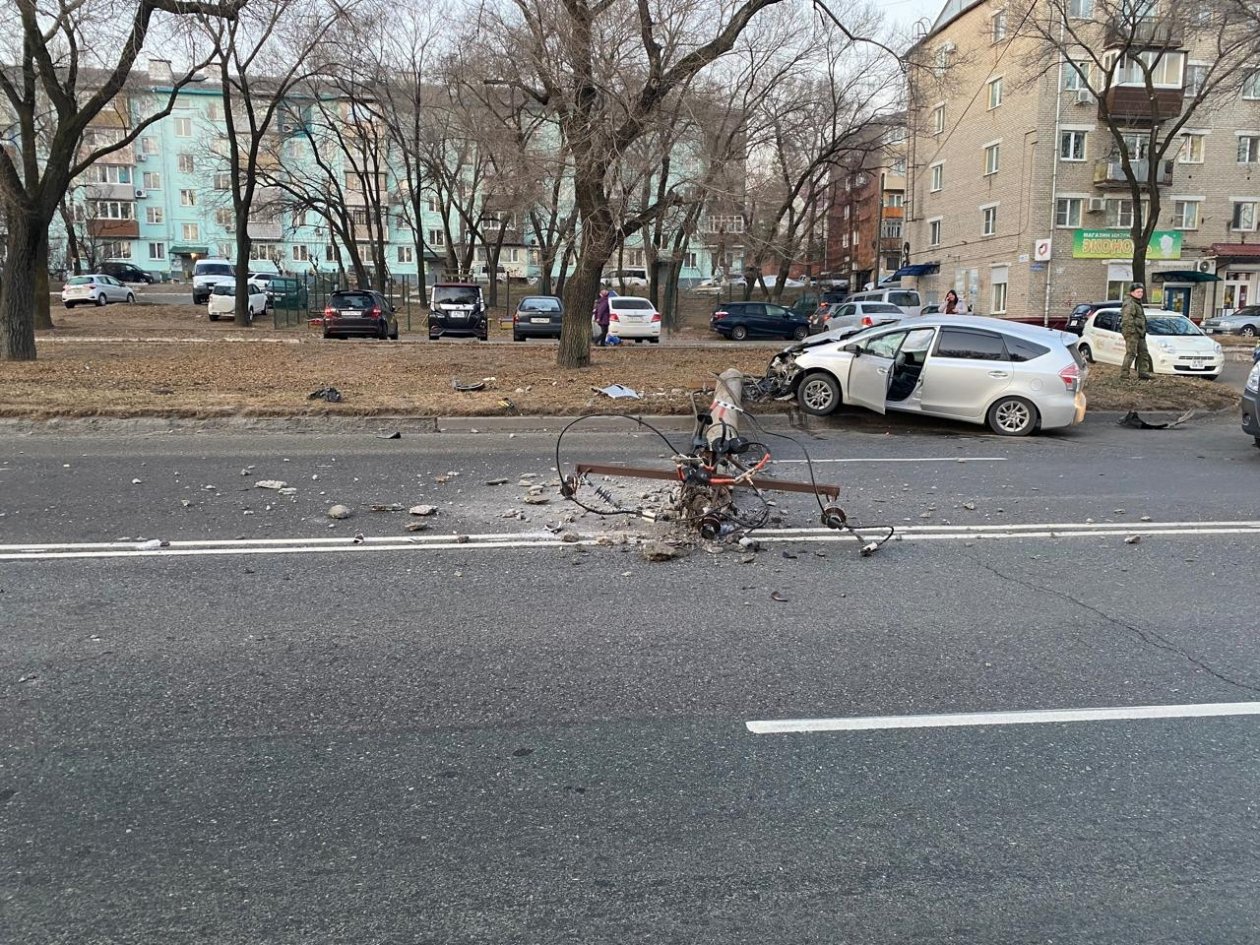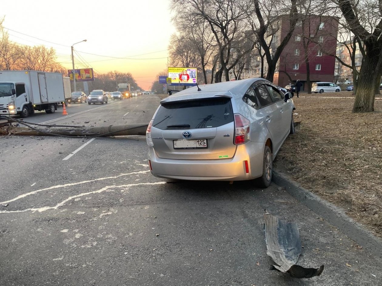 "Приус" сбил опору ЛЭП и устроил утренний коллапс в Уссурийске
