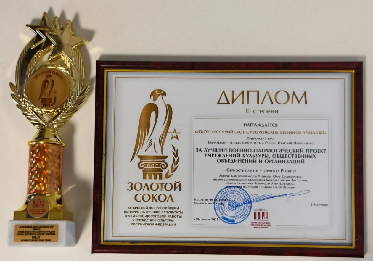 UssurMedia, 24 ноября. Юные патриоты из Уссурийска добились всероссийского признания. Видеопроект Уссурийского суворовского военного училища завоевал почетное третье место на XIX Всероссийском конкурсе "Золотой сокол" (12+). В работе "Верность памяти — верность Родине" (12+) ребята рассказали о сохранении семейной истории, поисковой деятельности и уникальном случае возвращения утерянного ордена Красной Звезды семье героя. С видеопроектом ознакомился корр. ИА UssurMedia.