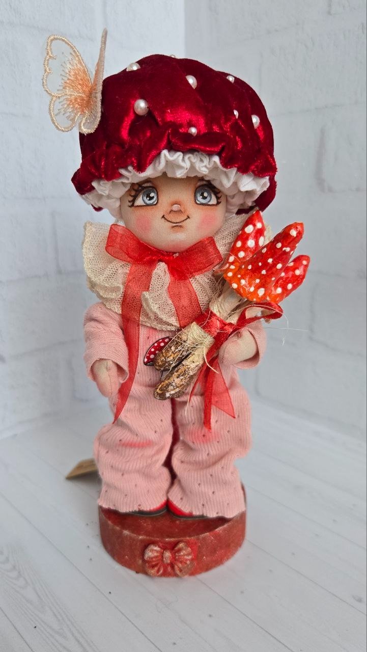 Отдельного внимания заслуживает Мухомор Мухоморович — оригинальная работа в смешанной технике, где раскрашенное и загрунтованное текстильное тельце увенчала шляпка с ватной накладкой для создания бесшовного и эстетичного эффекта. Персонаж был облачен в плащ из ткани, а в руке держал посох, который Екатерина вылепила из глины. Экспозицию дополняли различные медвежата Тедди и слоники, а также несколько ранних авторских кукол.
