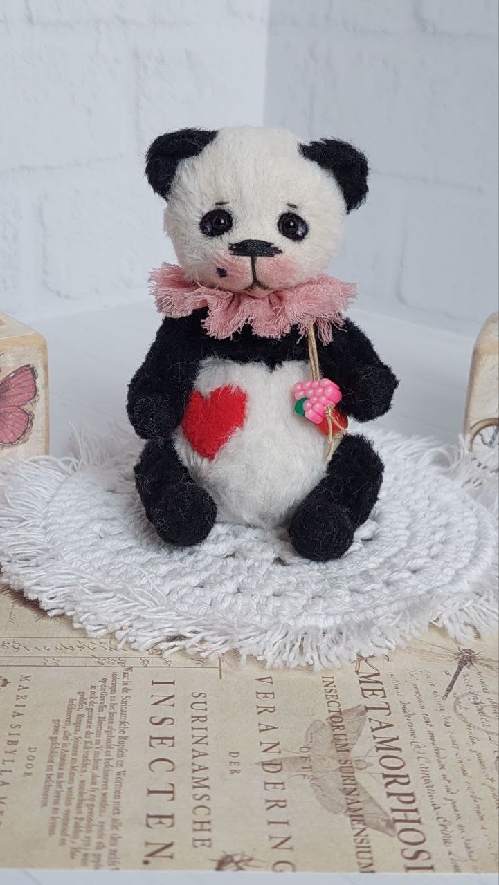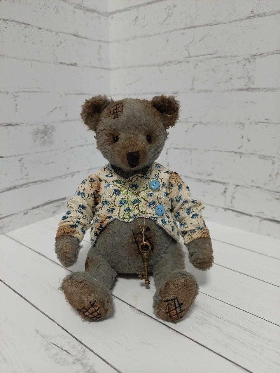 "Я назвала его "Мой мишка". Его особенностью является комбинированная набивка, включающая древесную шерсть, опилки крупной и мелкой фракции, металлический и стеклянный гранулят — мелкие шарики. Мишка сознательно создан слегка потрепанным и в заплатках, напоминая старую игрушку из детства", — рассказала мастерица.