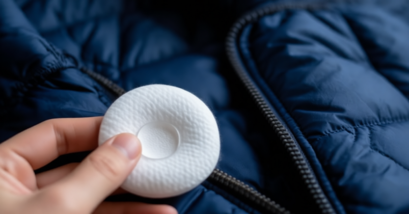 Лёгкими промакивающими движениями (без трения!) обработайте загрязнённые участки: воротник, манжеты, карманы. Для швов и капюшона используйте ватную палочку — она идеально подойдёт для труднодоступных мест.