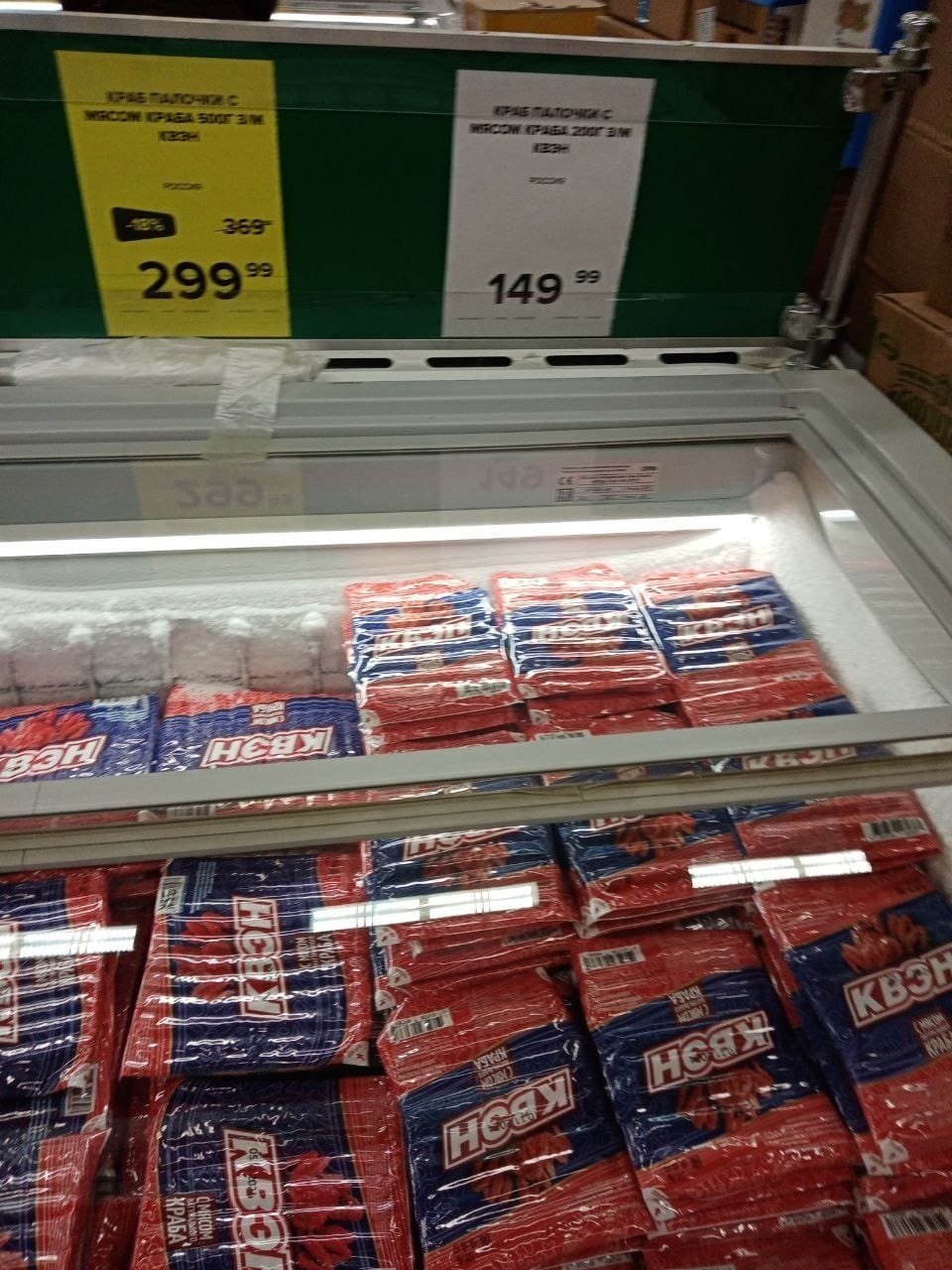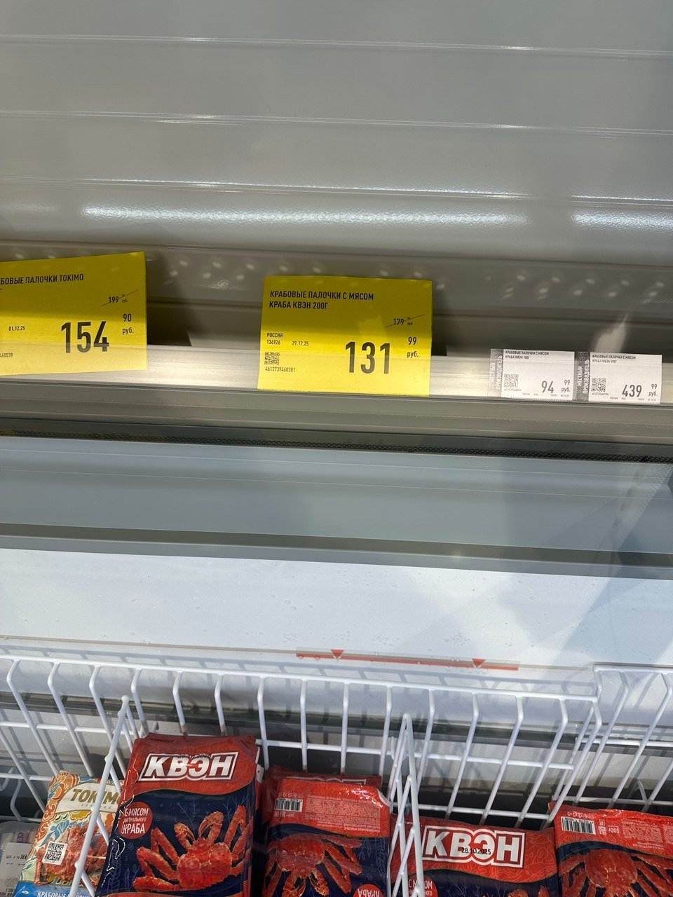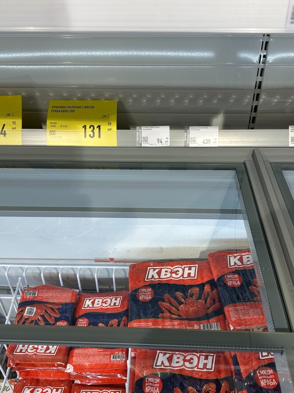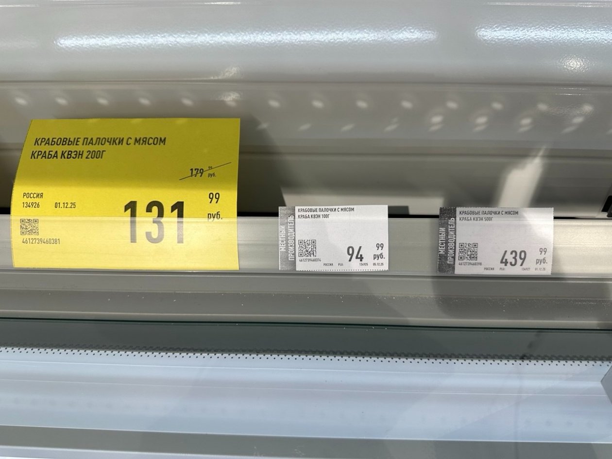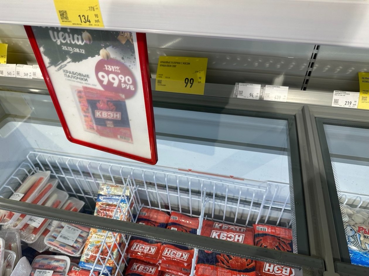 Под наблюдение попал ценник на 200-граммовую пачку крабовых палочек популярной марки. 15, 16 и 22 декабря он оставался неизменным — 131,99 рубля. Однако с 25 по 28 декабря на товар действовала акция: за товар просили 99,9 рубля. Уже в понедельник, 29 декабря, крабовые палочки вновь продавались по 131,99 рубля за 200 г.