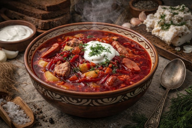 Белорусский борщ не терпит спешки, ему нужно дать настояться хотя бы 15–20 минут. Подают его горячим, со щедрой ложкой сметаны и свежей зеленью. Лучше всего он раскрывается с чёрным хлебом или ржанными гренками. Этот борщ не просто еда, а пример того, как простые продукты могут создавать сложный и запоминающийся вкус. Он густой, сытный, с лёгкой кислинкой и чесночным послевкусием, которое остаётся надолго.