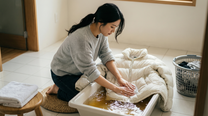- Не выжимайте и не трите — просто промокайте, чтобы не сместить пух и не растянуть материал.