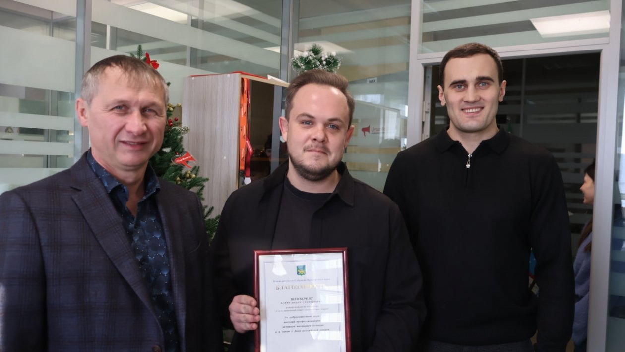 Александр Захаров также вручил сотрудникам UssurMedia награды от Законодательного собрания Приморья за добросовестный труд, высокий профессионализм и активную жизненную позицию. Корреспондент Александр Шепырев удостоился благодарности краевого парламента, а SMM-корреспондент Марина Кудрявцева — благодарственного письма.