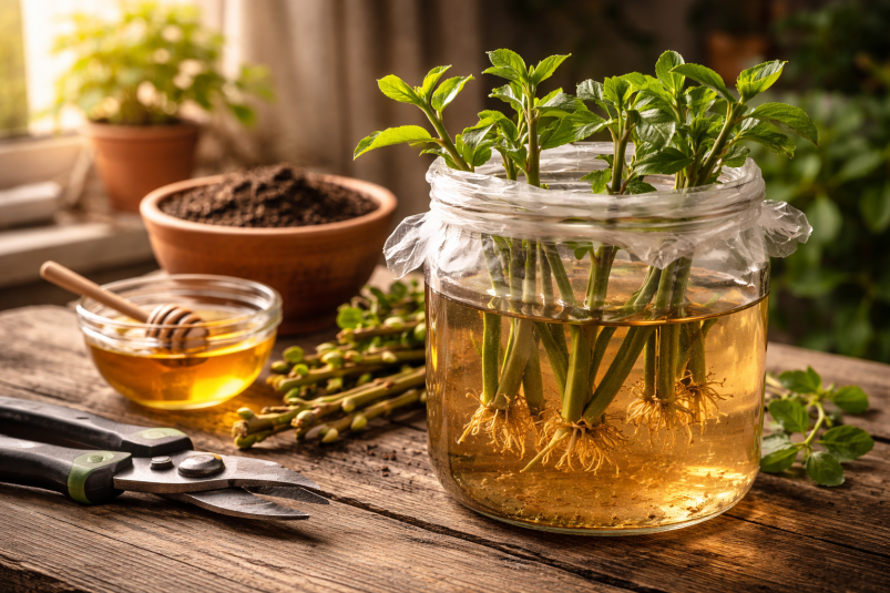 Перед тем как поставить побег в ивовую воду, его нижний край слегка обмакивают в мёд. Он работает как природный антисептик и создаёт защитную плёнку, не давая бактериям проникать в ткани растения.