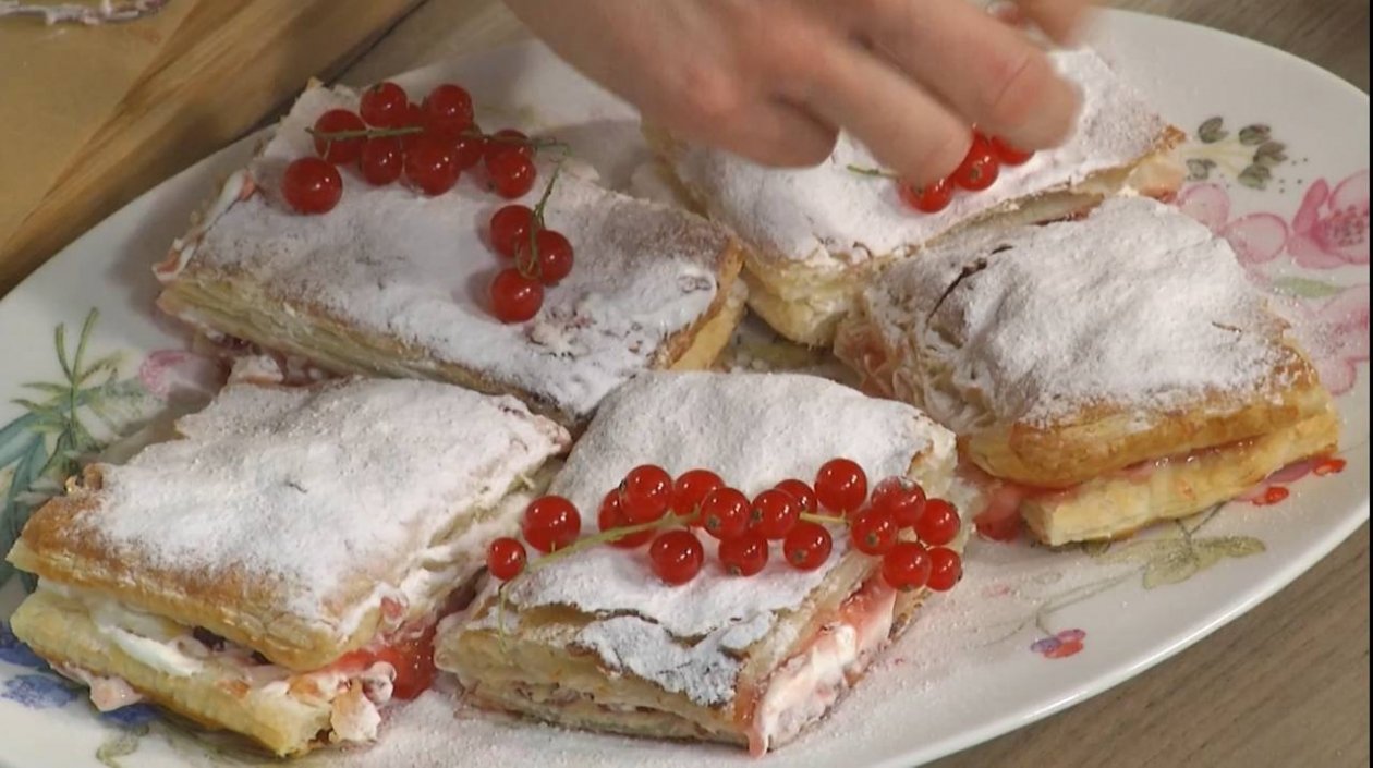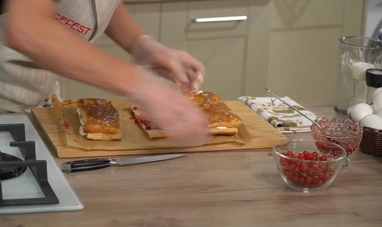 4. Затем корж разрежьте на небольшие прямоугольники одинакового размера, затем переверните красивой стороной вниз. Менее поджаренную часть смазать смородиновым джемом, а сверху — сливками через один. Затем соединить все и разрезать пополам, перенести на красивую тарелку. По желанию украсить сахарной пудрой.