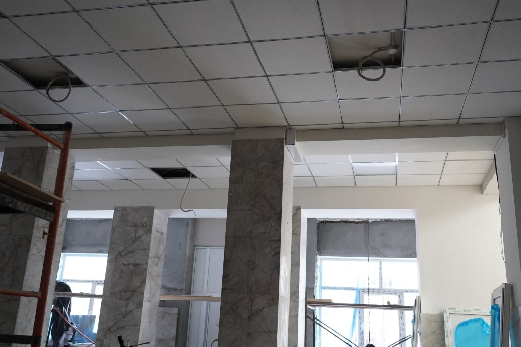 К моменту прибытия комиссии строительная бригада выполнила отделку потолков на двух этажах, уложила кафель на колоннах, панелях и лестничных маршах. На объекте проведена электропроводка, смонтирована система видеонаблюдения и противопожарная система.
