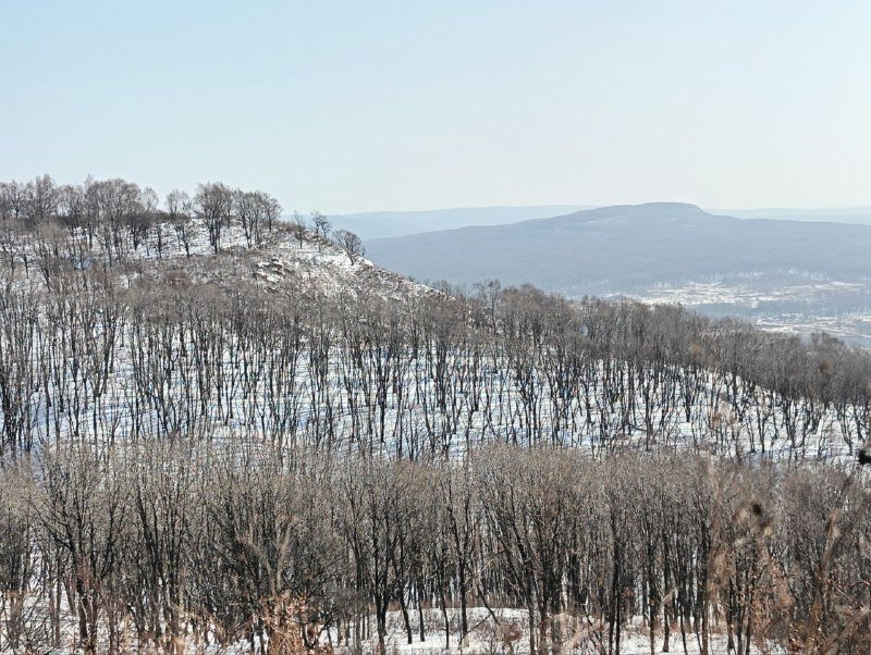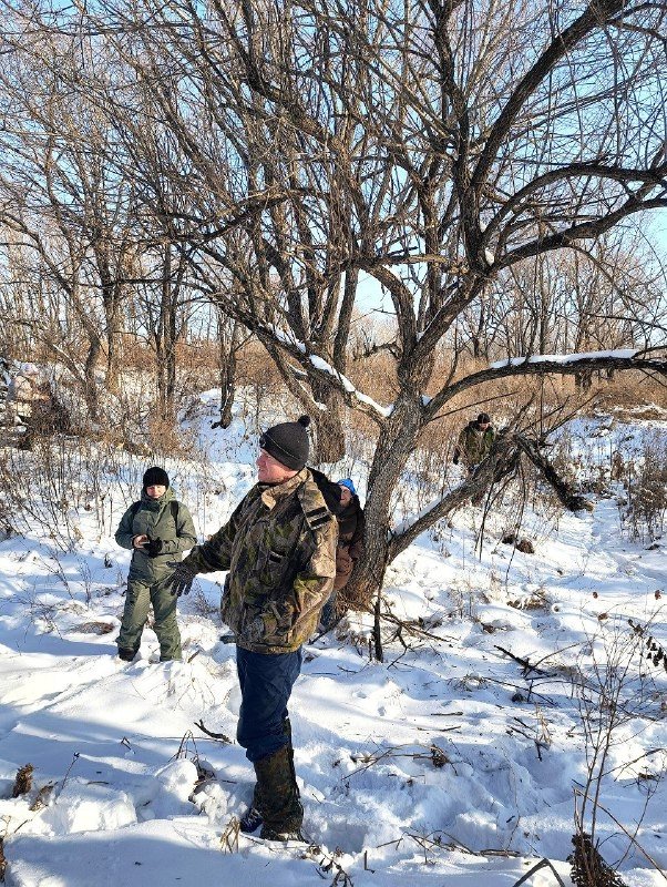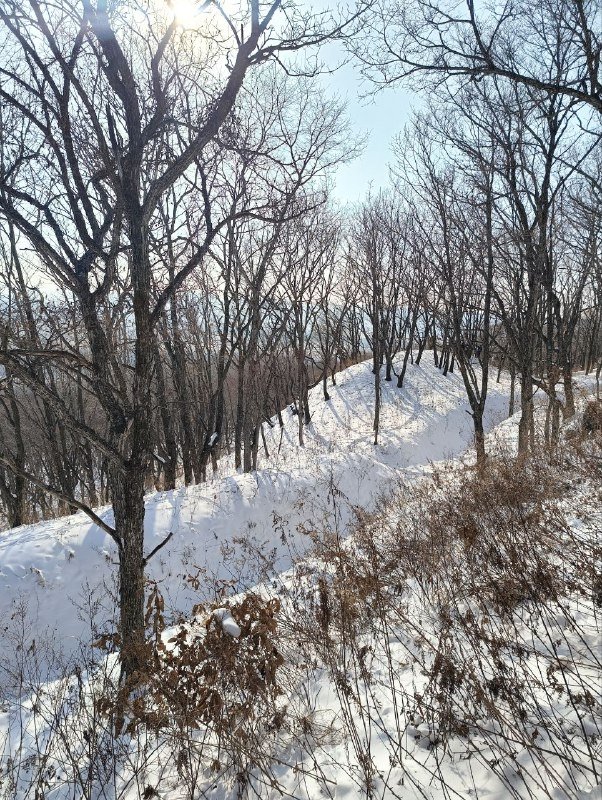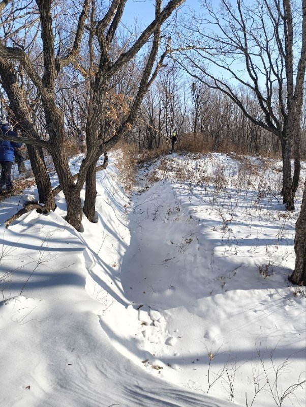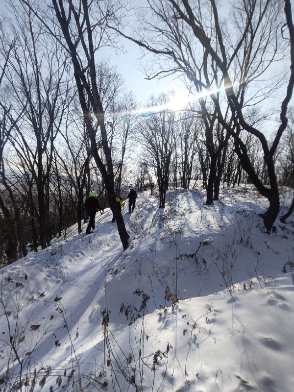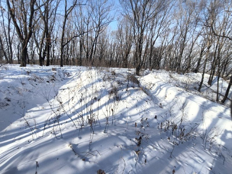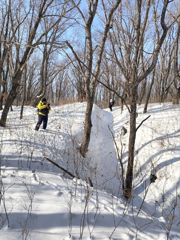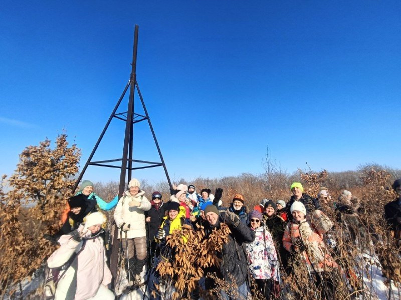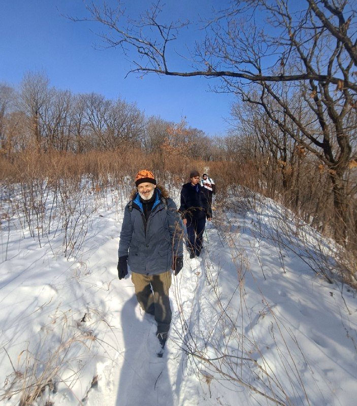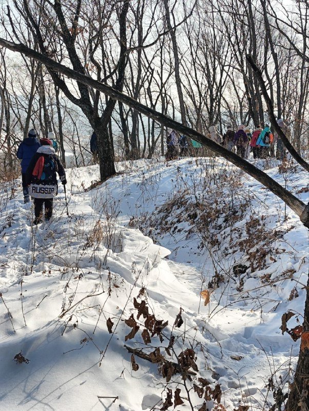 Руководитель похода Юна Надина сфотографировала группу у инфощита маршрута, который Лига поставила ещё в 2023 году. От него мы свернули с садовой дороги и по тропинке вышли на старую заброшенную дорогу. Не так давно этот заросший путь мы вдвоем с уссурийским астрономом-любителем Дмитрием Гришиным расчистили от мелкого кустарника. Дорога, под снегом местами уже неразличимая, шла среди дубов и вывела нас к началу плато горы. После резкого подъема мы оказались на заросшем полынью, леспедецей, орехом и прочим мелким кустарником обширном плато. К счастью, здесь мы с Дмитрием ещё осенью выкосили небольшой участок для любительских астронаблюдений и астрофото, поэтому лиговцы смогли перевести дух и немного отдохнуть на ровном чистом участке, а не среди зарослей.
