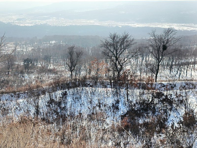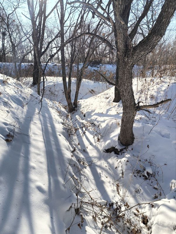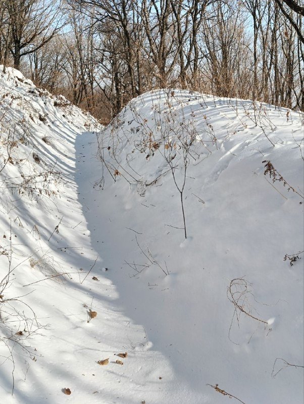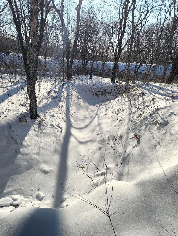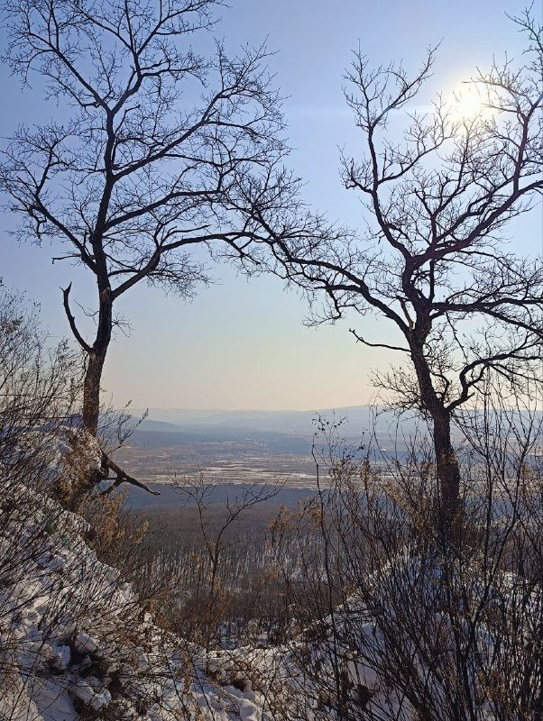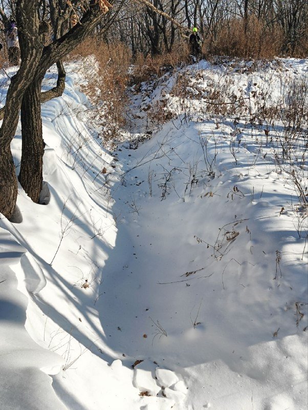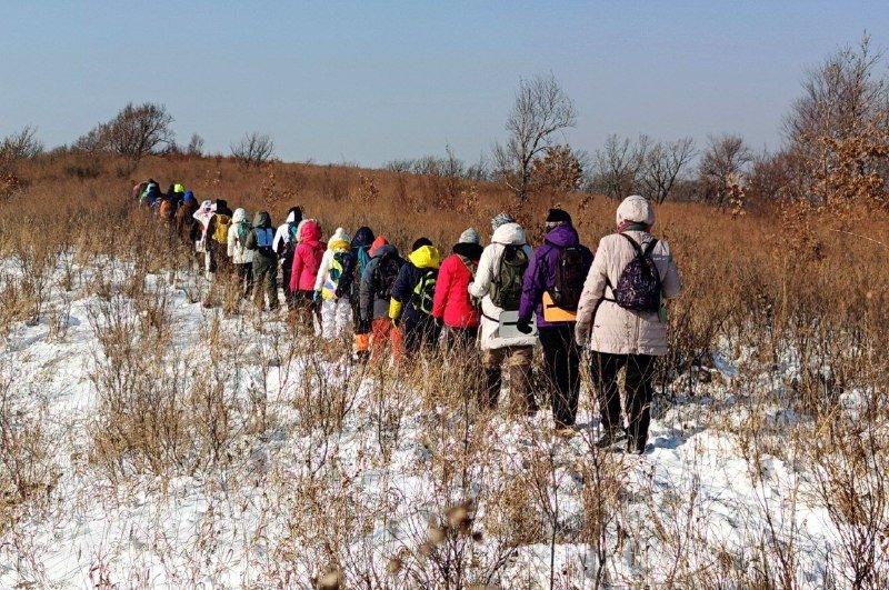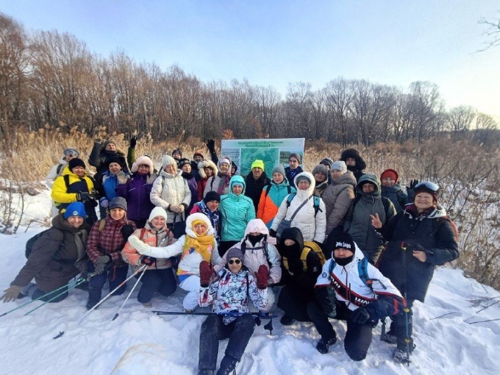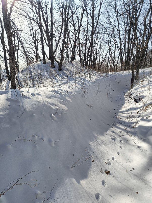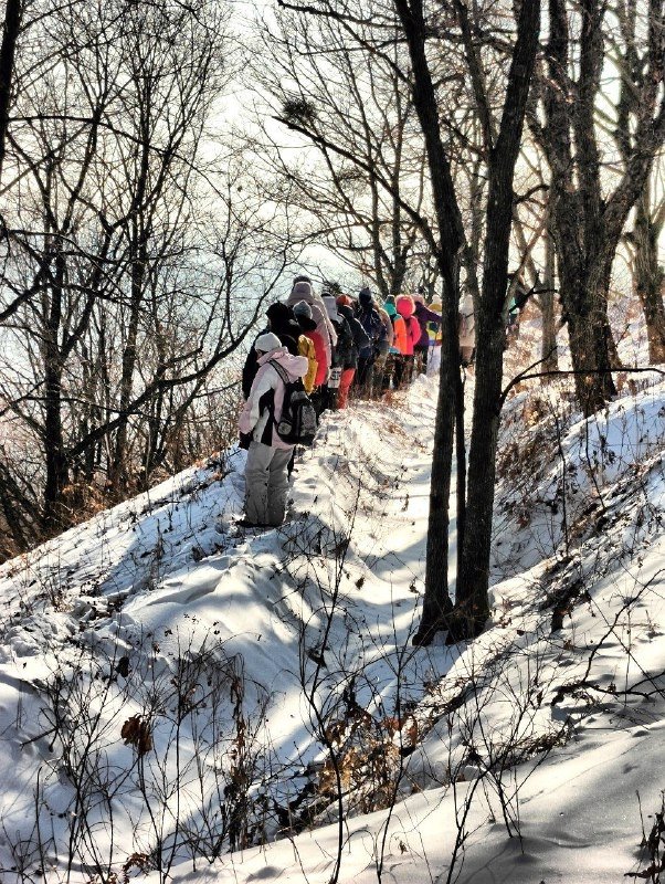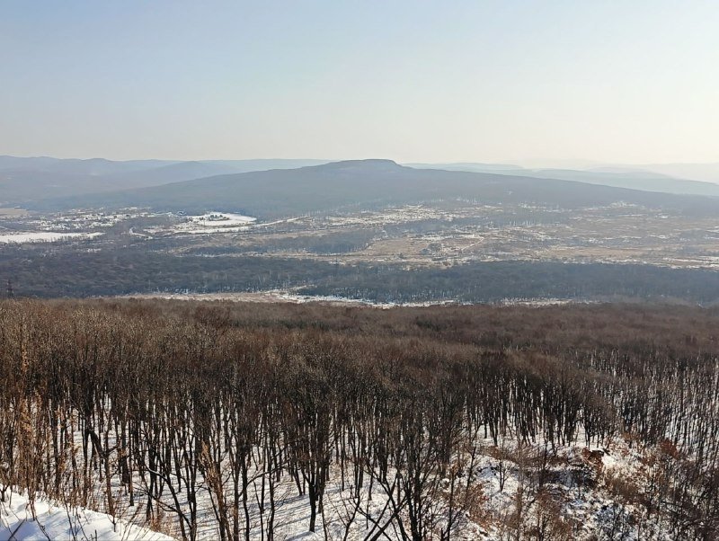 Руководитель похода Юна Надина сфотографировала группу у инфощита маршрута, который Лига поставила ещё в 2023 году. От него мы свернули с садовой дороги и по тропинке вышли на старую заброшенную дорогу. Не так давно этот заросший путь мы вдвоем с уссурийским астрономом-любителем Дмитрием Гришиным расчистили от мелкого кустарника. Дорога, под снегом местами уже неразличимая, шла среди дубов и вывела нас к началу плато горы. После резкого подъема мы оказались на заросшем полынью, леспедецей, орехом и прочим мелким кустарником обширном плато. К счастью, здесь мы с Дмитрием ещё осенью выкосили небольшой участок для любительских астронаблюдений и астрофото, поэтому лиговцы смогли перевести дух и немного отдохнуть на ровном чистом участке, а не среди зарослей.