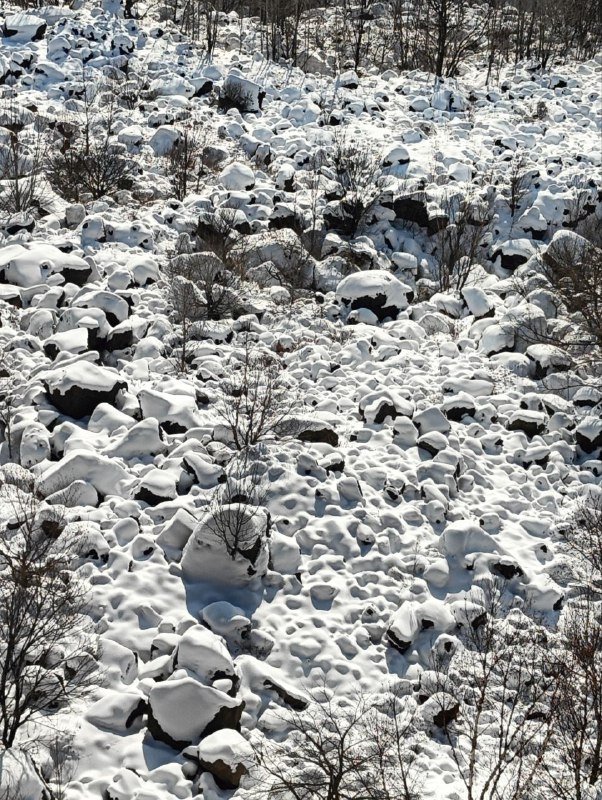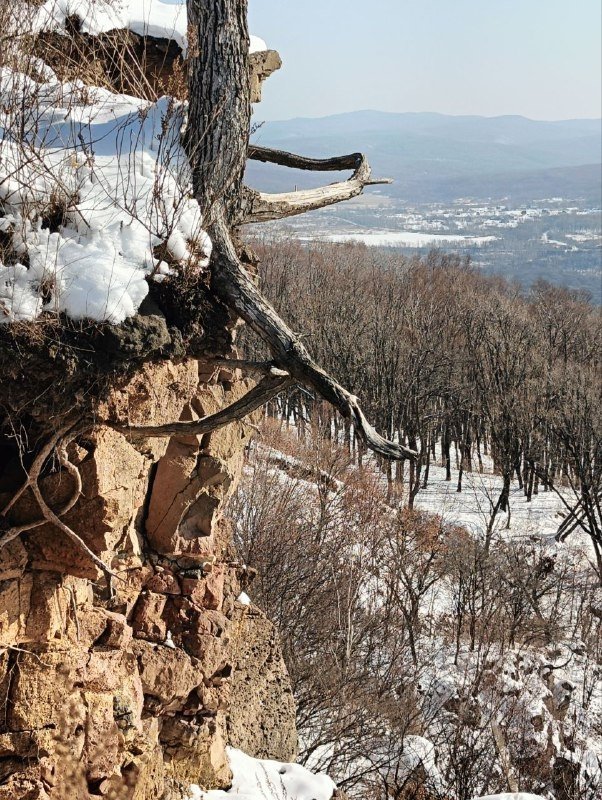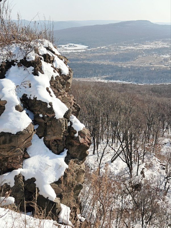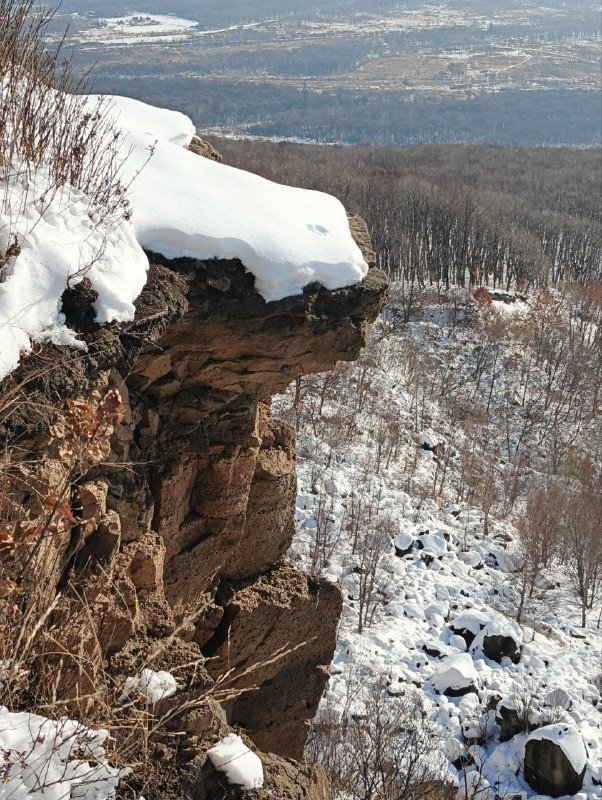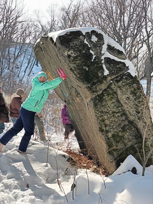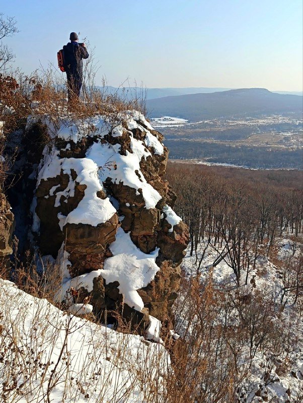 Чтобы вернуться к автобусу, надо отдать набранную у горы высоту, отдать осторожно. Тропа по гребню заканчивается крутым спуском высотой в дом. Некоторые участники похода превратили спуск в веселые покатушки со снежной горки, кто-то спустился обычным порядком. Далее — ещё один спуск к каменным скульптурам. Огромные образования из валунов и каменных плит. Словно стены или башни. Участники похода обратили внимание, что скалы-останцы местами параллельны друг другу. Значит, мы видим залегание древних вулканических пород. Выветривание убрало всё мягкое, оставив только эти скалы, стоящие как памятники бурному вулканическому прошлому Приморья.