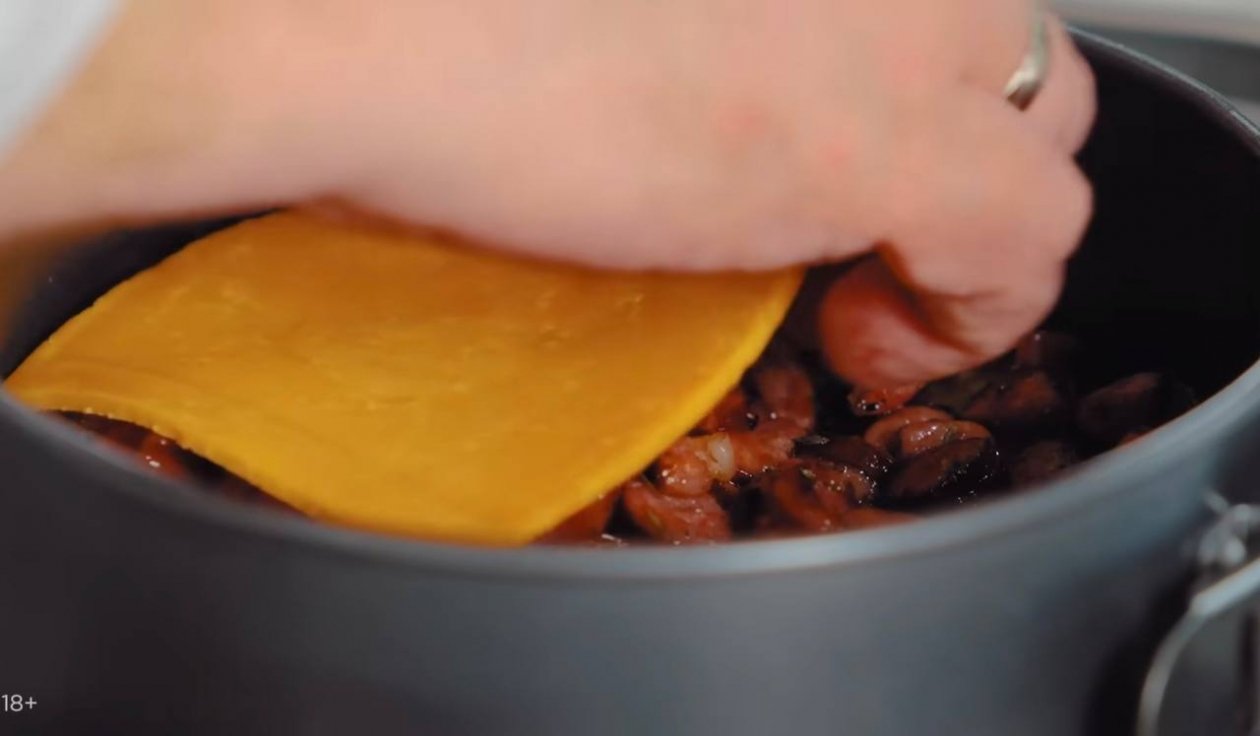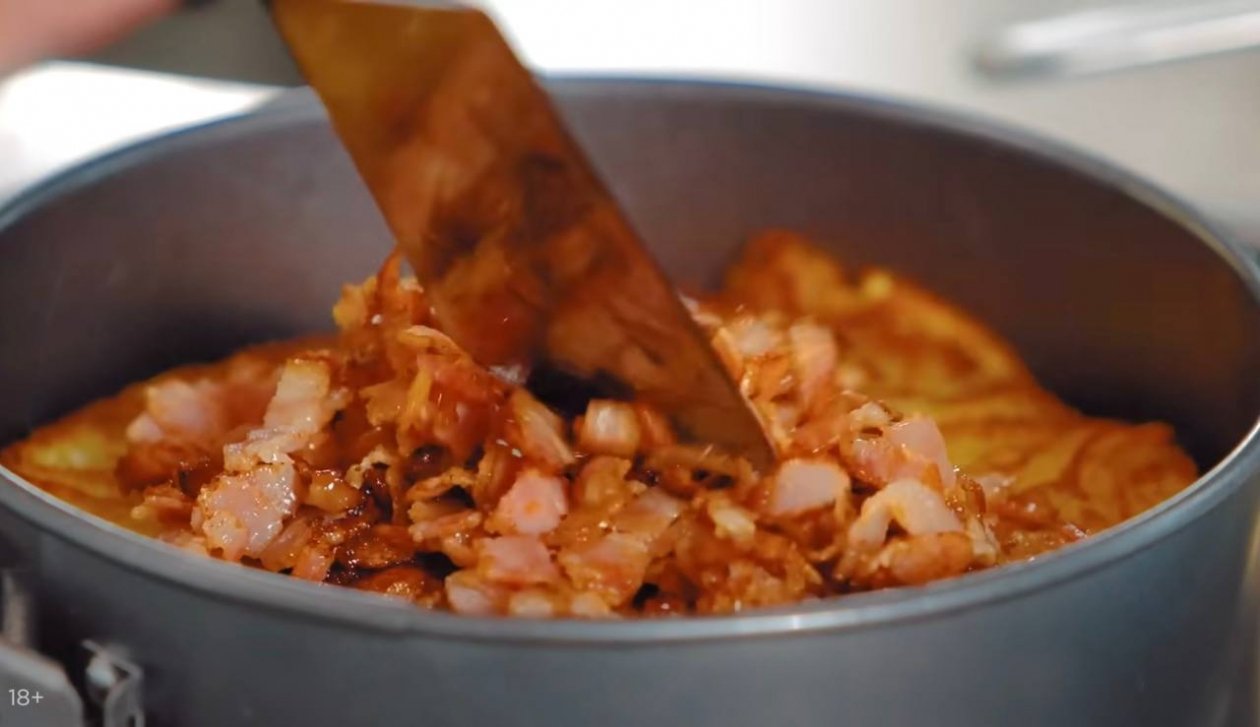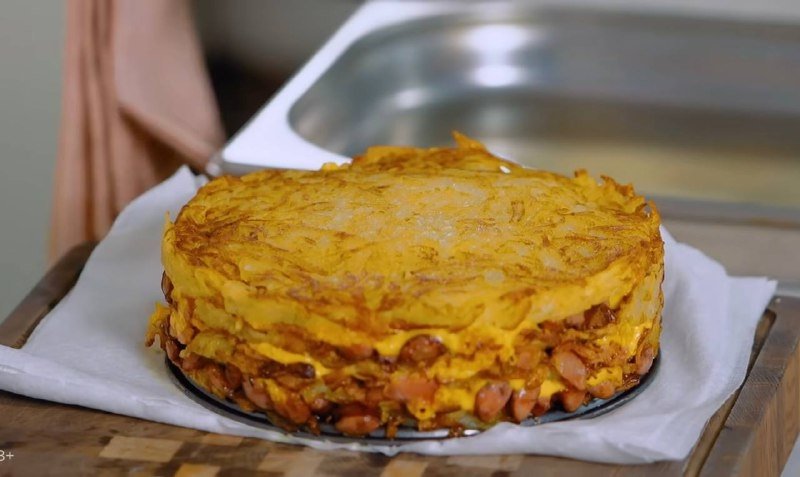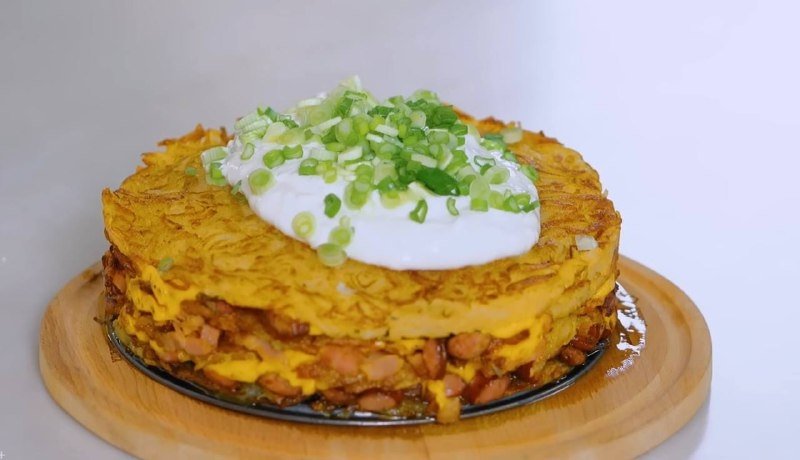 4. Когда и начинка готова, и картофеля остаётся немного, начните уже складывать торт. Для этого возьмите разъёмную форму, выложите лепёшку, потом копчёные колбаски, распределите их равномерно. Сверху 2-3 ломтика сыра, тогда и сцепление произойдёт. Накройте снова драником, можете даже придавить эту конструкцию. Далее пойдёт бекон, сыр и снова драник. Если осталась начинка, тогда самое время положить её сверху и закройте её снова сыром и последним драником. Не забудьте, что надо всё хорошенько утрамбовать.