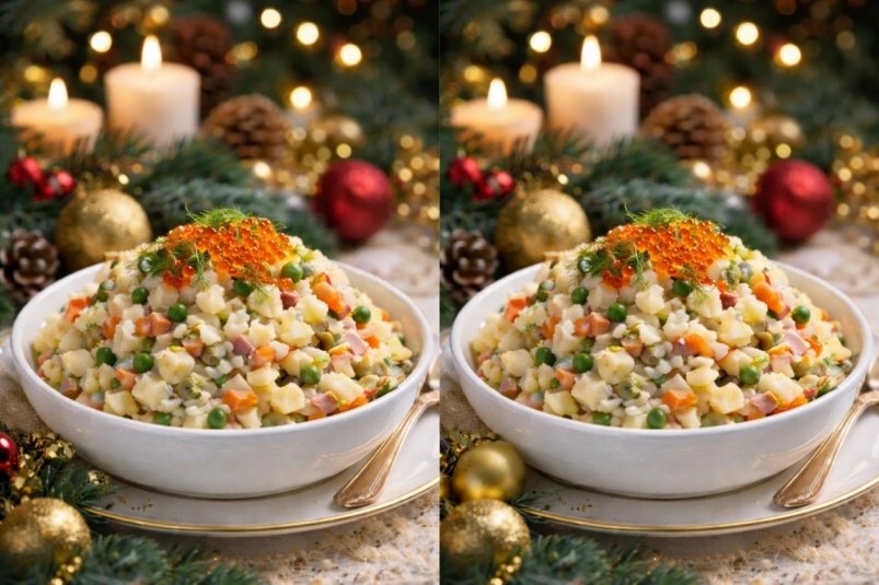 На первый взгляд — это два абсолютно одинаковых салата оливье в праздничном оформлении. Классика новогоднего стола, знакомая каждому. Но не всё так просто, между картинками спрятаны небольшие отличия, которые заметят только самые внимательные. Сможете ли вы найти их все?