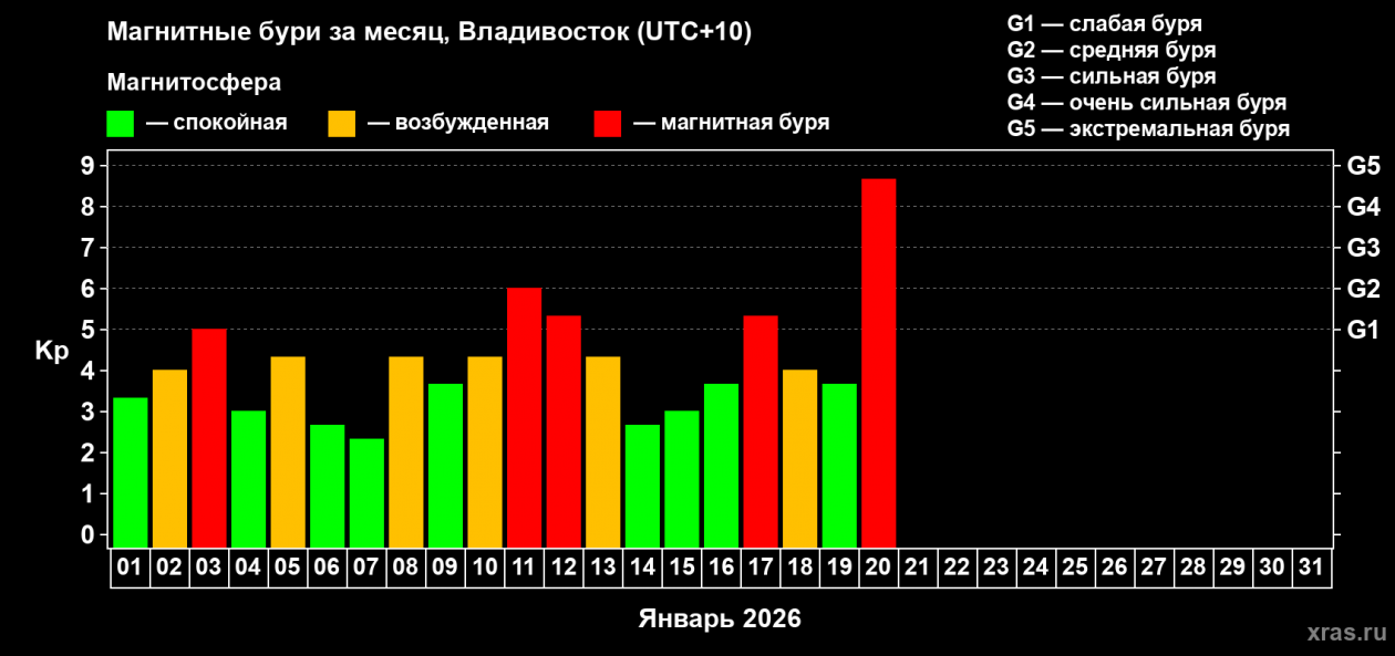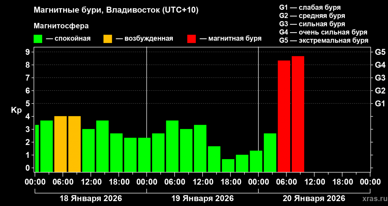 UssurMedia, 20 января. На Земле происходит планетарная магнитная буря. В районе 09.00 часов утра по времени Владивостока она достигла уровня G4.7, по силе приблизившись к значениям экстремальной бури. Если характеристики солнечного ветра не изменятся, то выход на высший уровень G5 произойдет в течение 1-2 часов, сообщает лаборатория солнечной астрономии ИКИ и ИСЗФ.