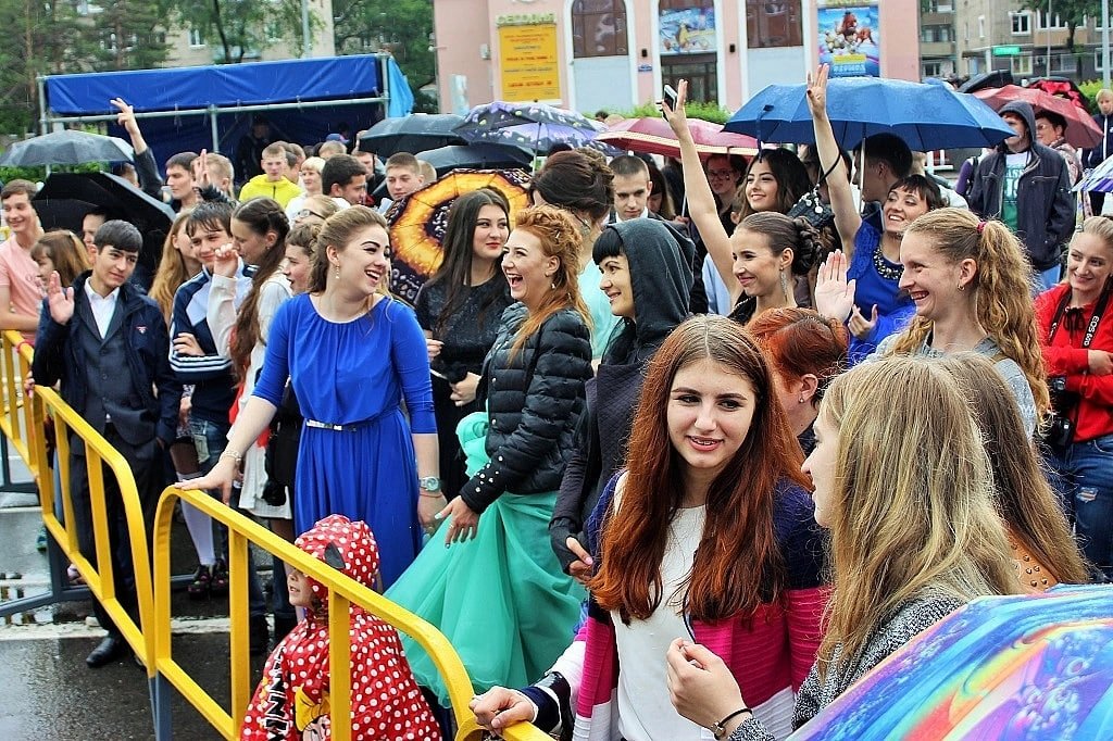В День молодежи центральную площадь заполонили элегантно одетые выпускники школ — праздник совпал с днем выпускных балов.