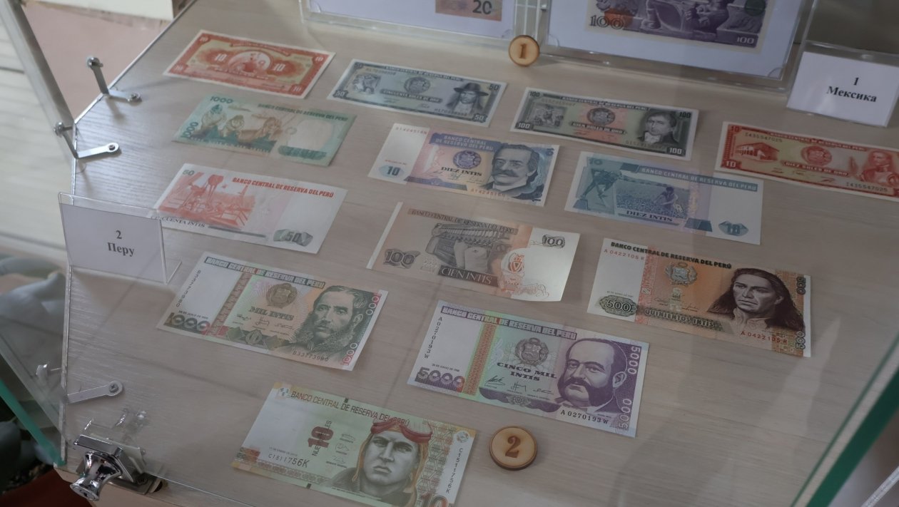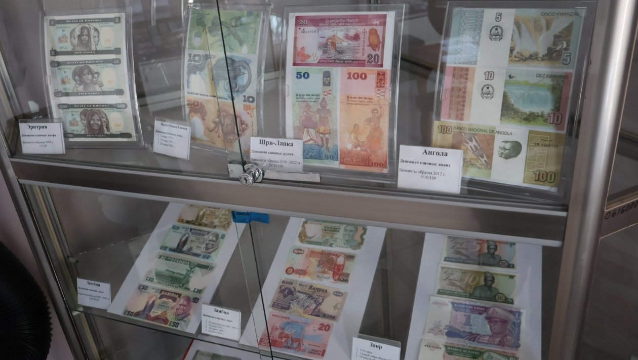 В экспозицию вошли деньги более чем из 30 стран мира. На витринах представлены, например, белорусские рубли, рупия Индонезии и Шри-Ланки, аргентинские песо и аустраль, фунты Южного Судана и Египта, даласи Гамбии, накфа Эритреи, кина Папуа — Новой Гвинеи, кордоба Никарагуа и многие другие.