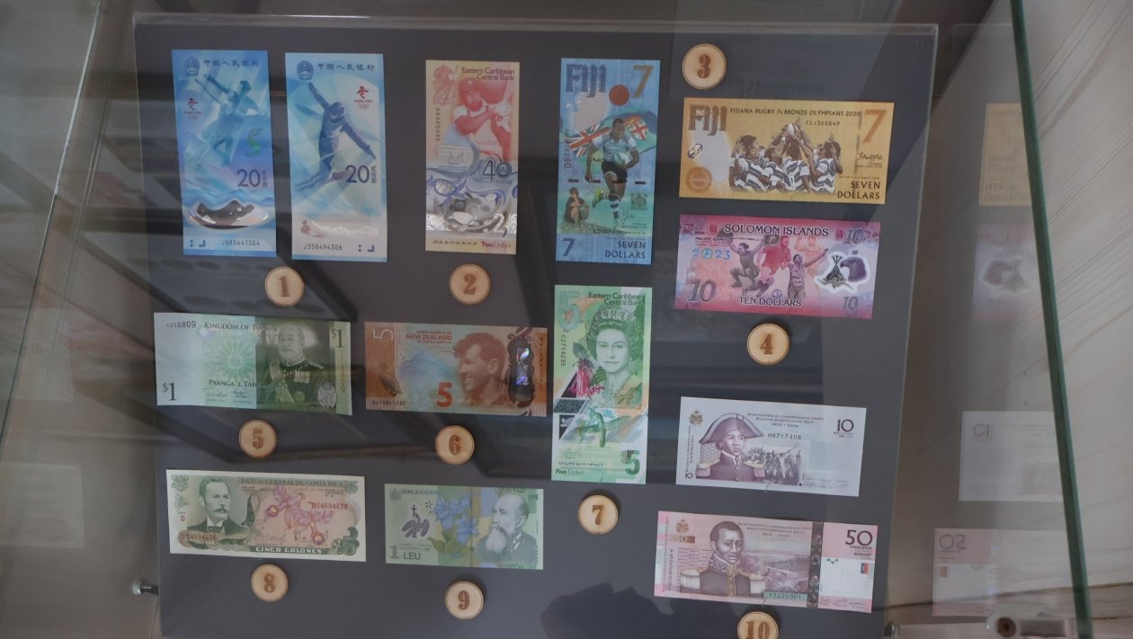 Представленные на выставке деньги не только разных разных размеров, номинала и дизайна, но и материалов. Некоторые страны выпускают полимерные деньги — они считаются более долговечными, хотя отличить от бумажных их можно лишь на ощупь. Гладить их утюгом, кстати, не советуют.