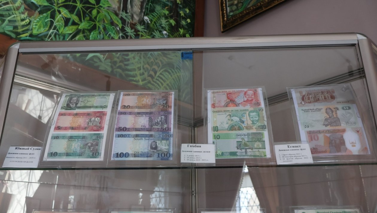 Африканским деньгам, напротив, присущи яркие краски. Тому подтверждение с музейных витрин — денежные единицы Анголы, Замбии, Заира, Гамбии, Южного Судана и других.