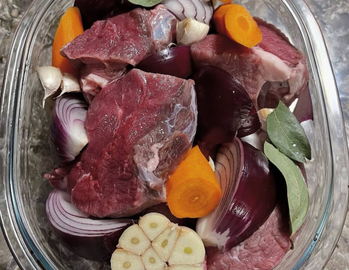 Вам понадобится: говядина, 1 целая головка чеснока, половина чистой моркови, 3 шт. лаврового листа, 2 шт. красного лука и вода.