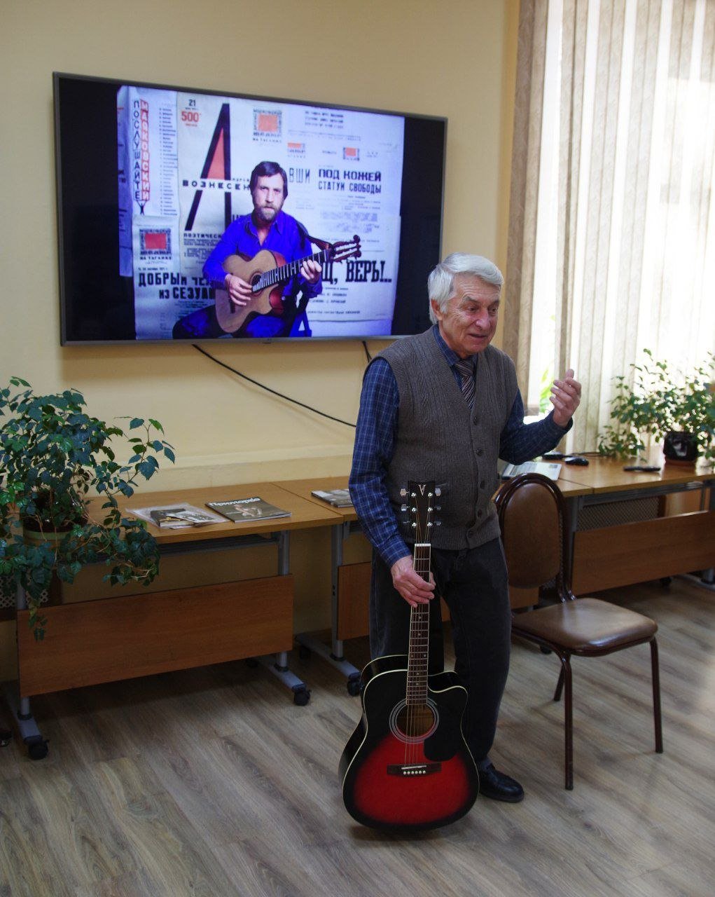 "Если бы Владимир Высоцкий жил в наши дни, о чем он бы писал и пел? Какие темы волновали бы его сегодня? На эти вопросы пытались ответить гости мероприятия, которые собрались в Центральной городской библиотеке накануне дня рождения артиста, поэта, барда. Однако большинство решило, что и в нашу эпоху ему было бы что сочинить, спеть, показать публике. Ведь актуальность его наследия — и песенного и артистического — до сих пор пользуется спросом и интересом. А еще спорили: Высоцкий — поэт, бард или актер? А может, "рупор эпохи", "совесть своего времени", или просто явление? Сам "виновник торжества" часто именовал себя именно артистом с гитарой. Вероятно, это самое точное его определение.