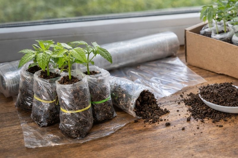 Использование плёнки вместо горшков даёт сразу несколько практических преимуществ. Во-первых, на одном подоконнике можно разместить в два–три раза больше рассады. Во-вторых, резко сокращается расход грунта, что особенно важно при выращивании большого количества растений. В-третьих, уход за рассадой становится более управляемым за счёт точного контроля полива.
