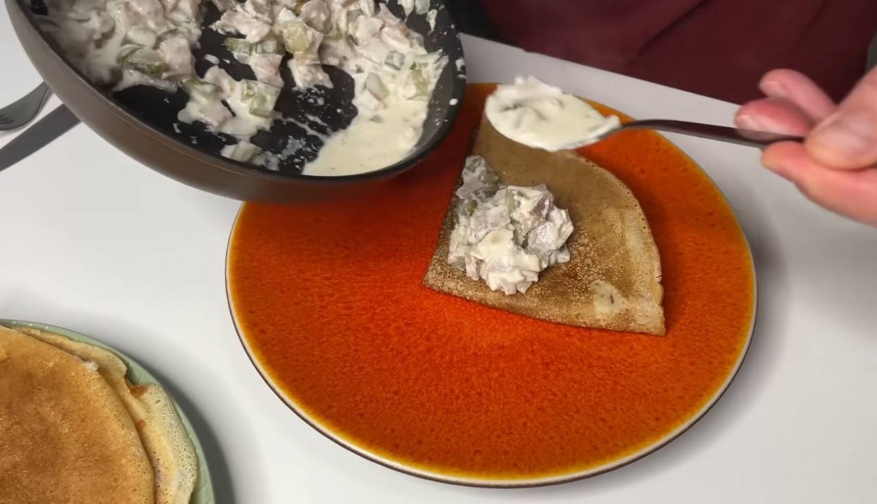 6. Когда начинка остыла, пора к сервировке блинов: сложите его пополам, а потом ещё раз. Сверху на прямоугольник выложите начинку.