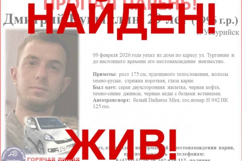 UssurMedia, 12 февраля. В Уссурийске завершились поиски молодого местного жителя, который уехал из дома 9 февраля и пропал. Парень найден живым, сообщает Tg-канал (18+) ПРОО "ПримПоиск".