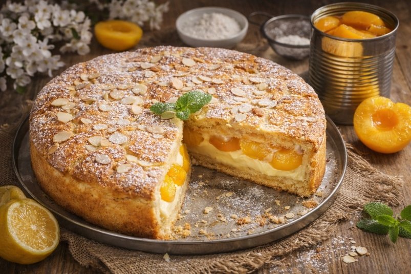 Иногда самые эффектные десерты рождаются из простых продуктов. Обычная банка консервированных персиков, немного времени и базовые ингредиенты — и на столе появляется пирог, который легко можно принять за выпечку из хорошей европейской пекарни. Нежное песочное тесто, лёгкий заварной крем и сочная фруктовая начинка делают этот десерт универсальным: и к вечернему чаю, и для гостей, и "просто порадовать себя".