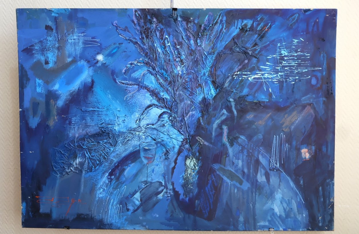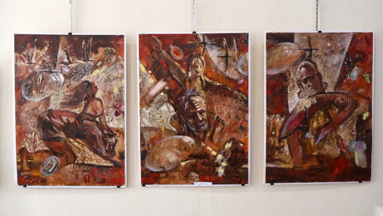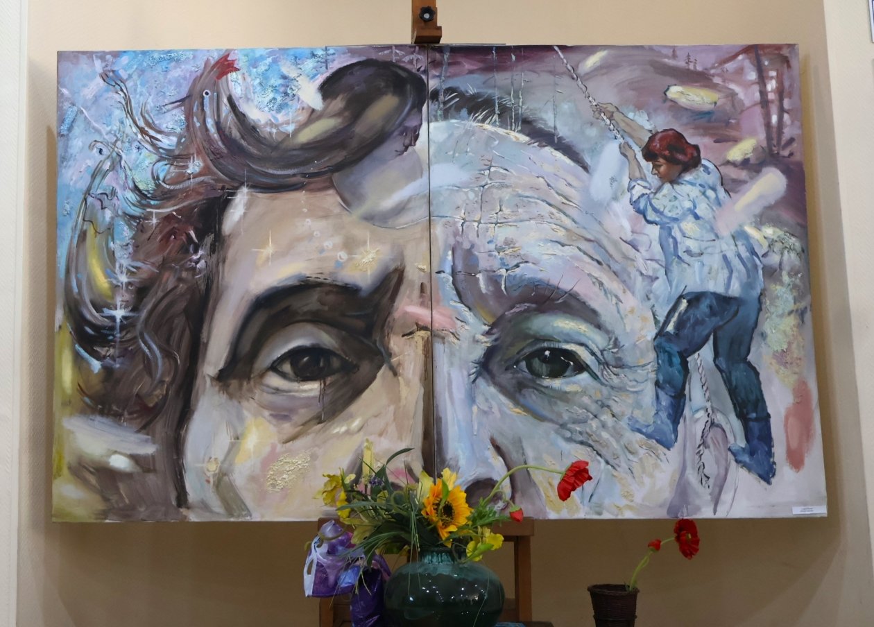 Среди основных жанров, представленных на выставке, преобладают философские пейзажи и автобиографические этюды. Например, триптих "Внучка", созданный в период разгула пандемии коронавируса, где люди оказались узниками четырех стен в режиме самоизоляции. В размашистых мазках — рассказ о том, как внучка объезжала деда словно норовистого скакуна, катаясь на спине живописца.