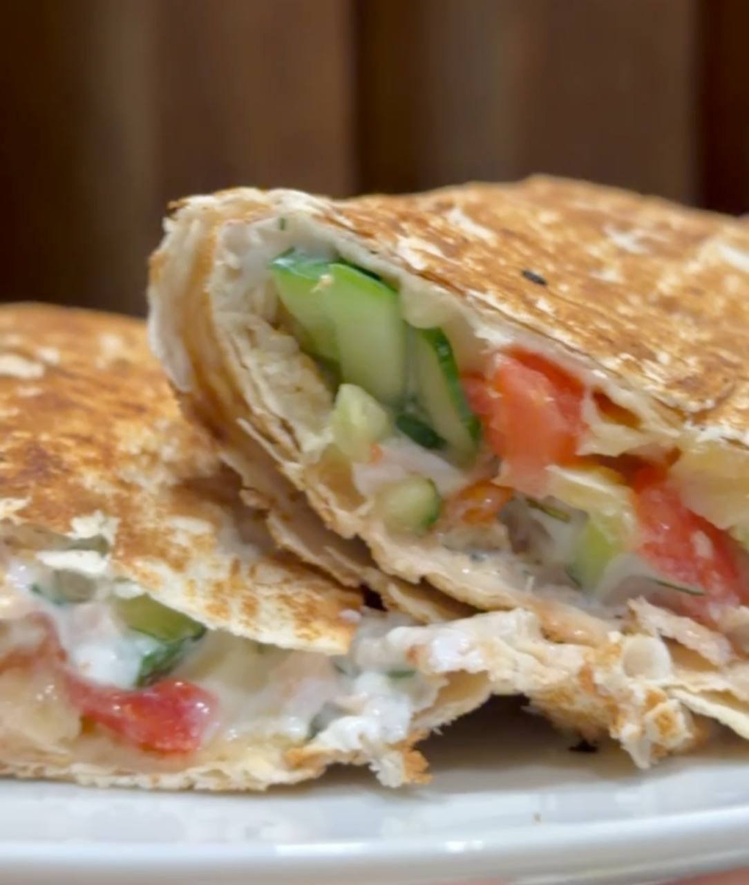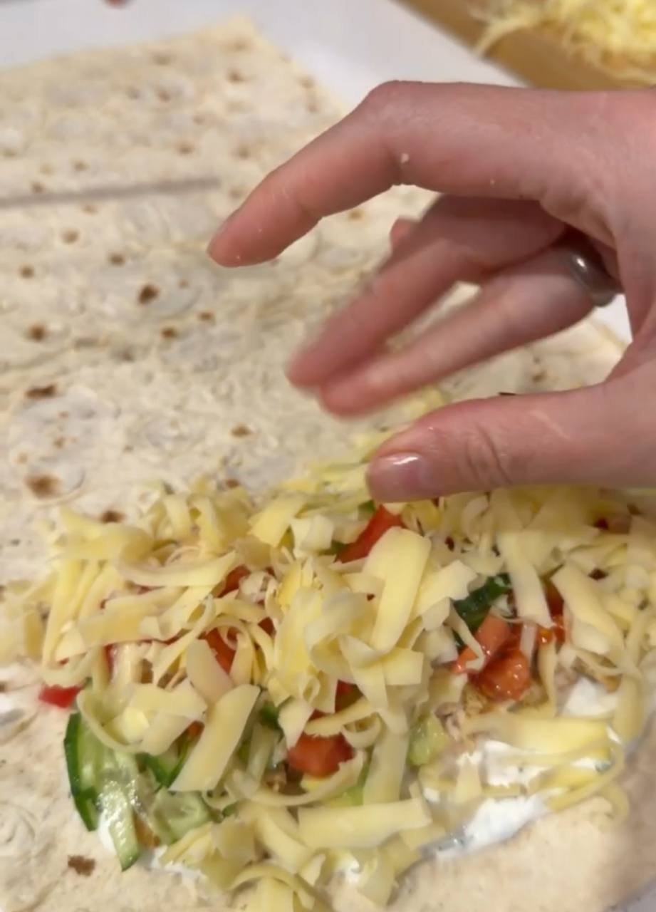 5. Когда всё будет готово, пора приступать к сборке блюда. Итак, разверните лаваш и разрежьте его на прямоугольники. Отступая немного от края, выложите первым слоем соус, курицу, огурцы, накройте помидорами, а сверху — натёртым сыром. Всё заверните и наслаждайтесь любым вкусом блюда.