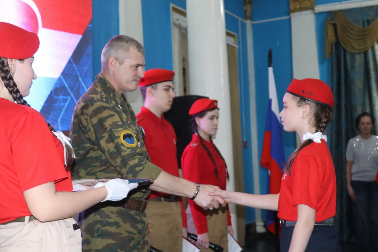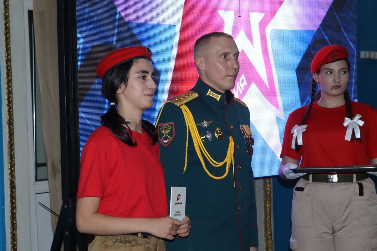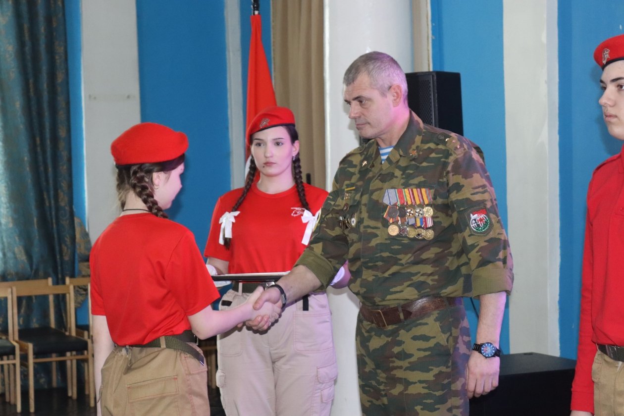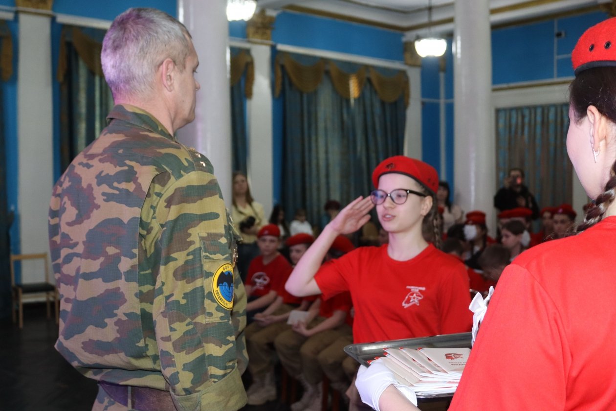 Книжки новоиспеченным юнармейцам вручали почетные гости: инструктор по военно-патриотической работе штаба 5-й армии Александр Горбань, ветераны боевых действий Виктор Береговой и Антон Немолякин. Как настоящие защитники Родины, школьники приветствовали старших товарищей воинским жестом и словами "Служу России".