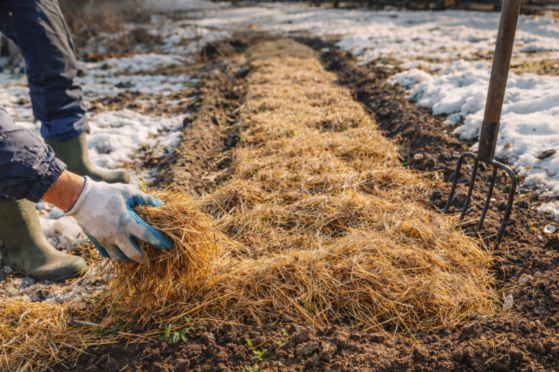 Осенью сено и солома продолжают работать. Грядки, укрытые мульчей, лучше сохраняют влагу и меньше промерзают зимой. Такой слой защищает почву от выветривания и разрушения структуры.