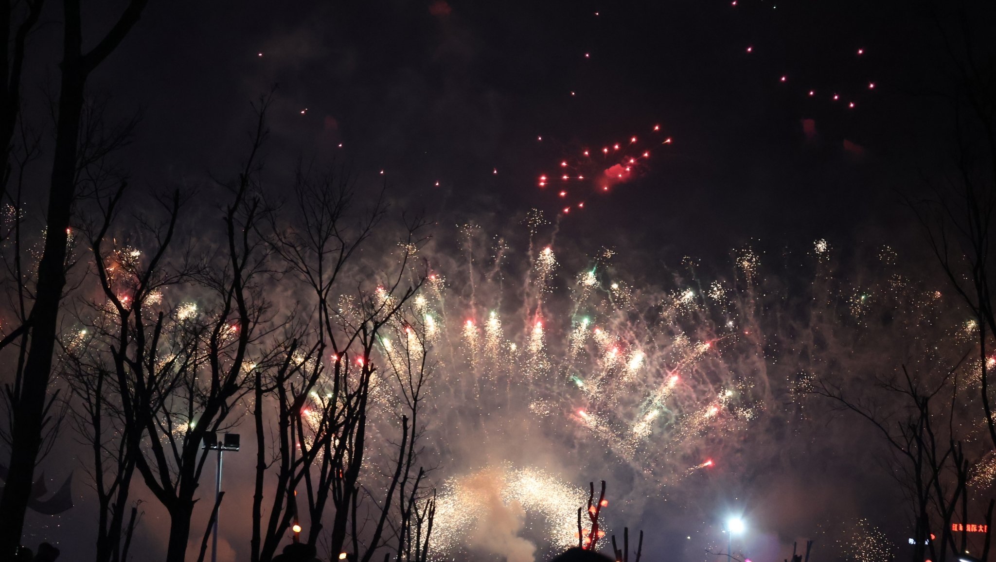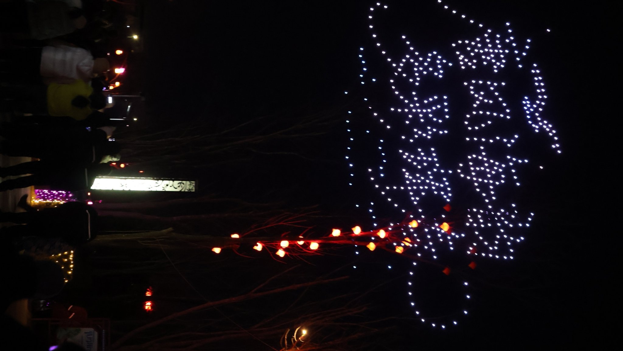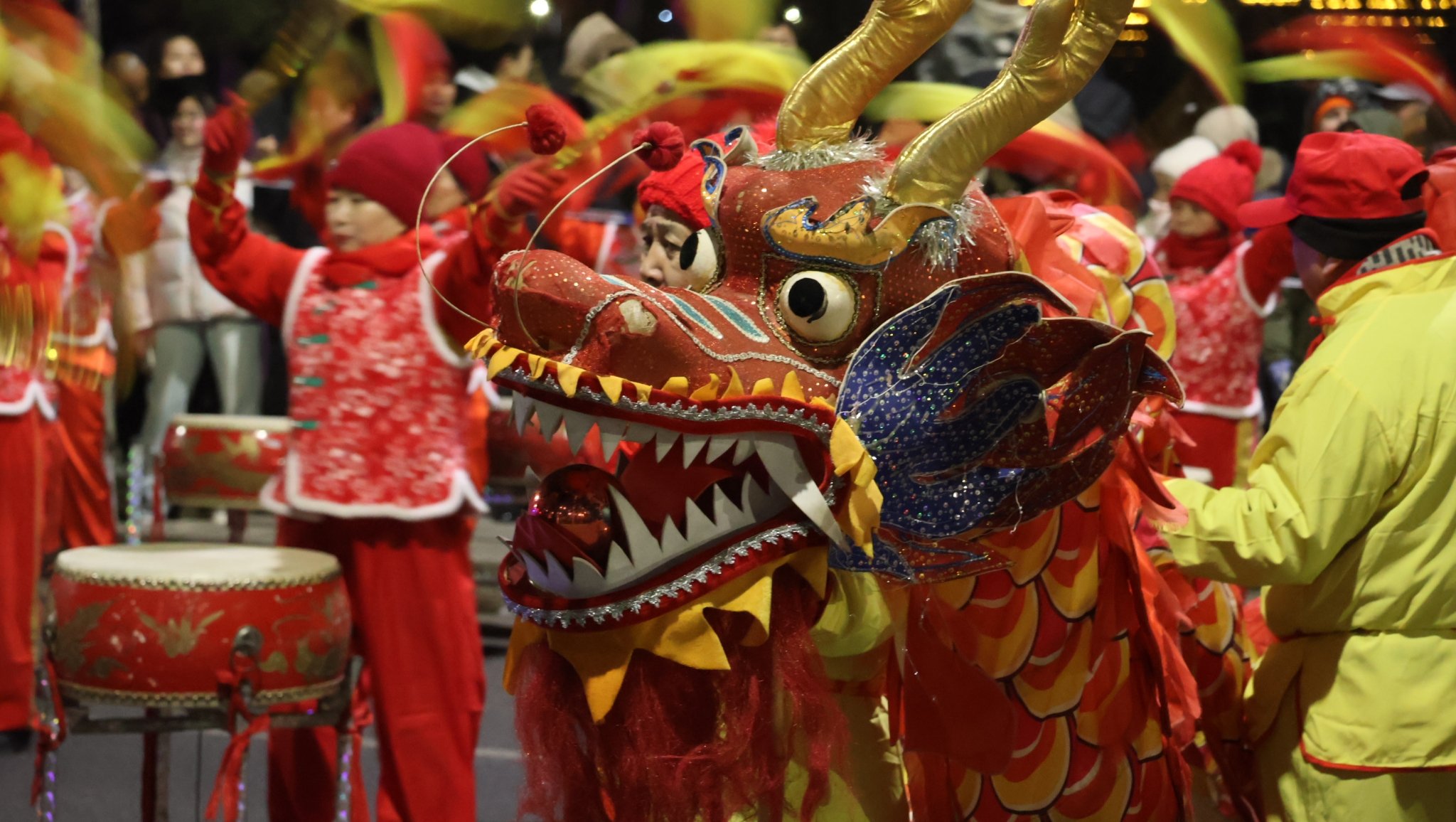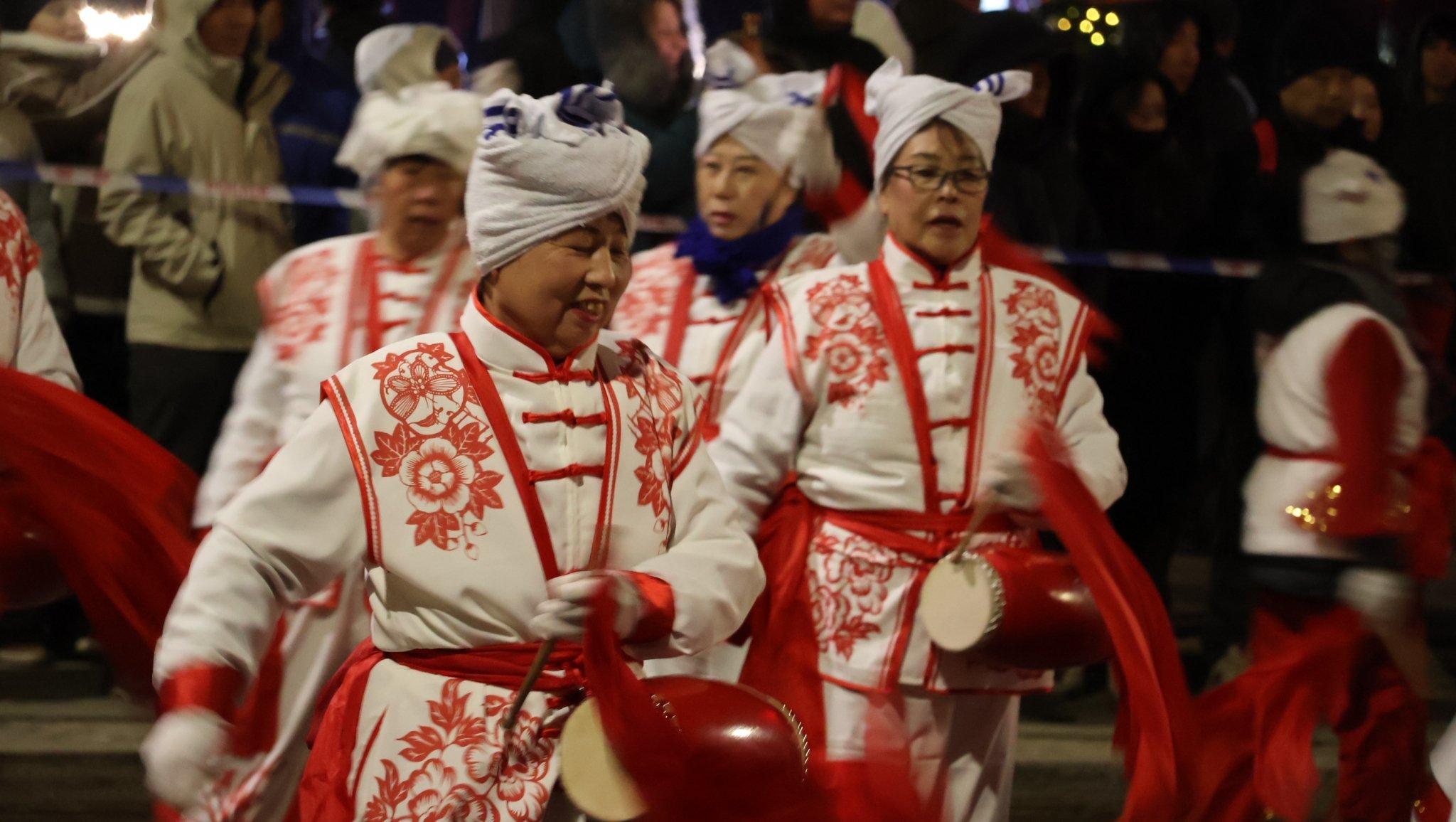 Народное гулянье развернулось на одной из улиц Хуньчуня: артисты исполняли традиционные танцы, играл духовой оркестр, по дороге "проплывал" яркий китайский дракон. Над площадью взмыли десятки дронов, которые выстраивались в фигуры в ночном небе, сменяющие друг друга под музыку.
