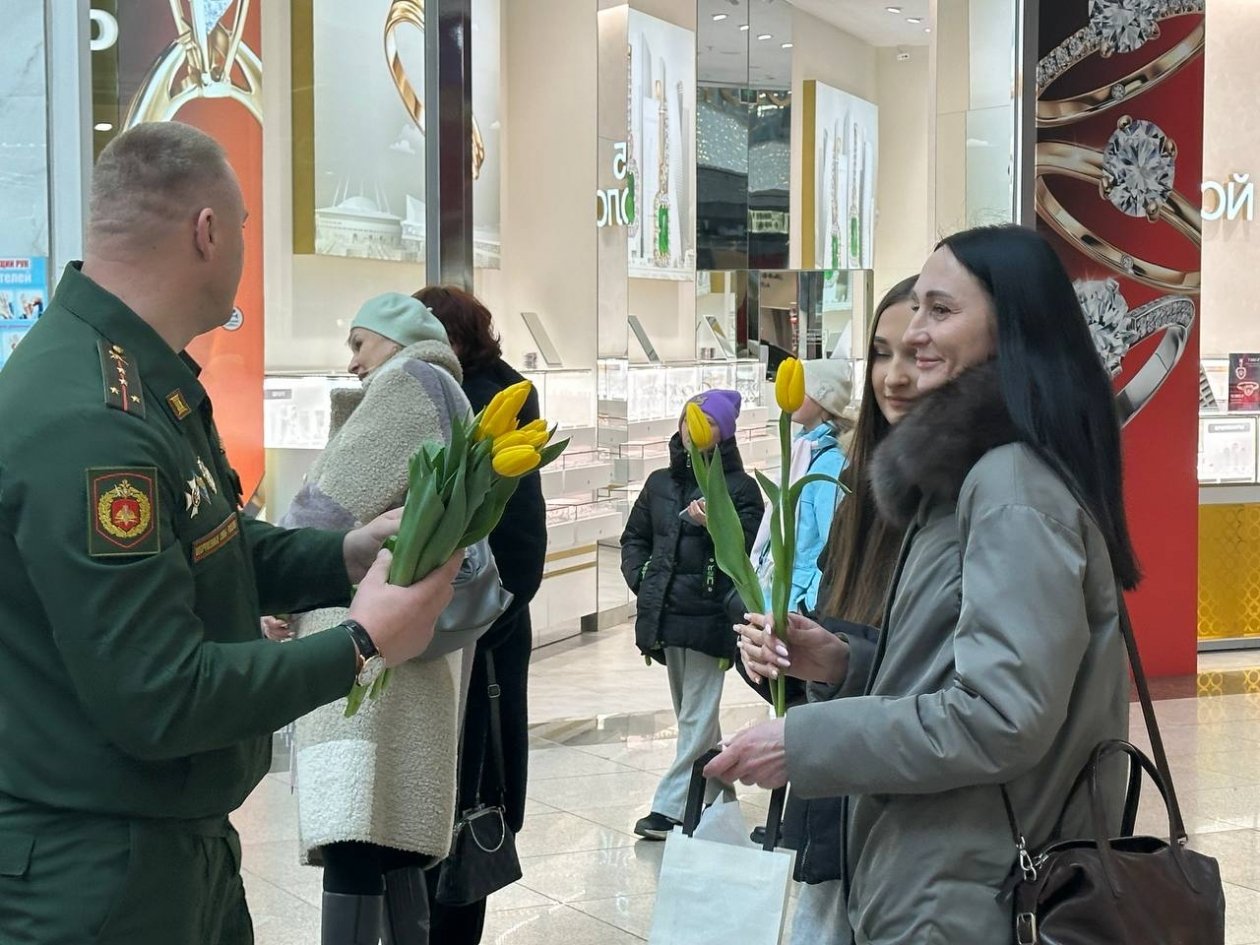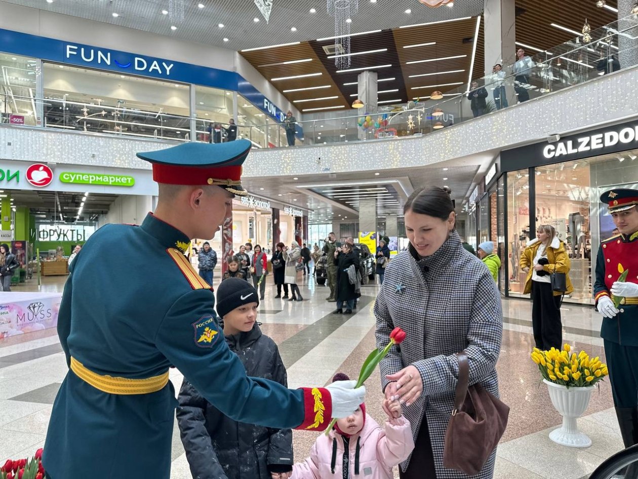 На этом праздник от командования и женсовета 5-й армии не закончился. Организаторы продолжили дарить цветы горожанкам в ТЦ "Москва".