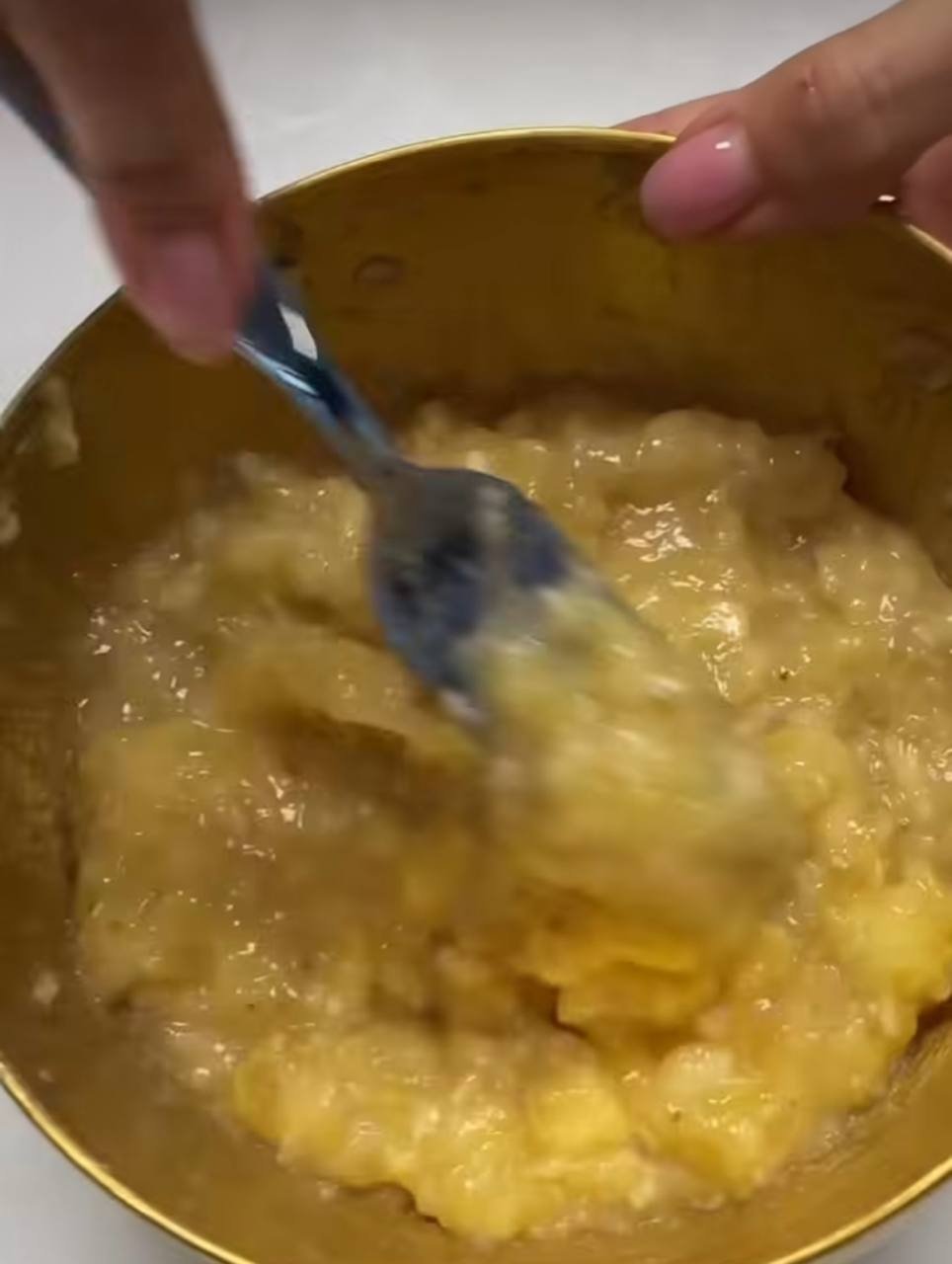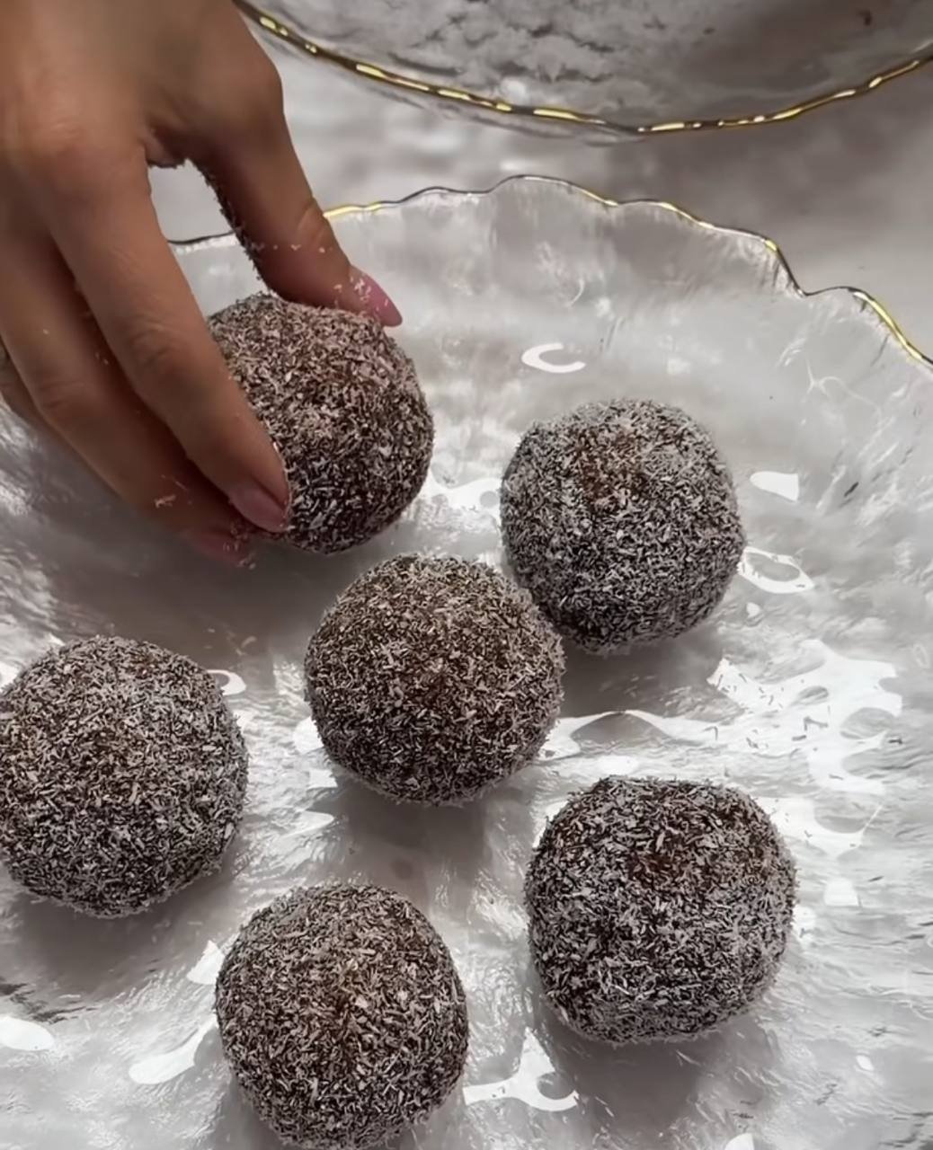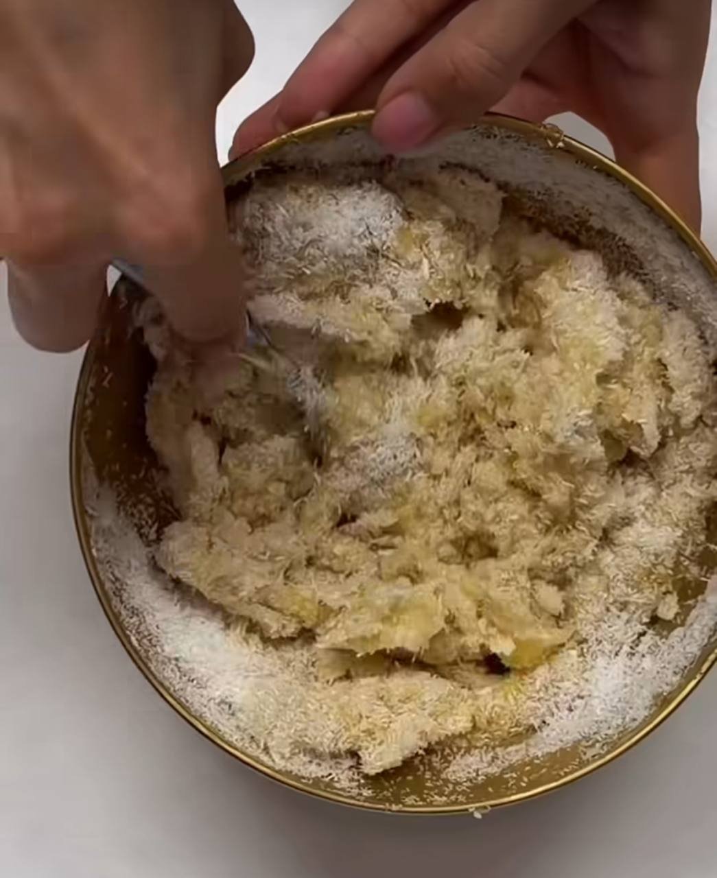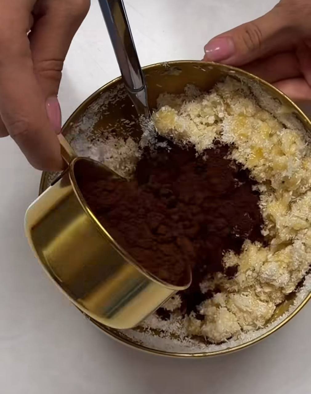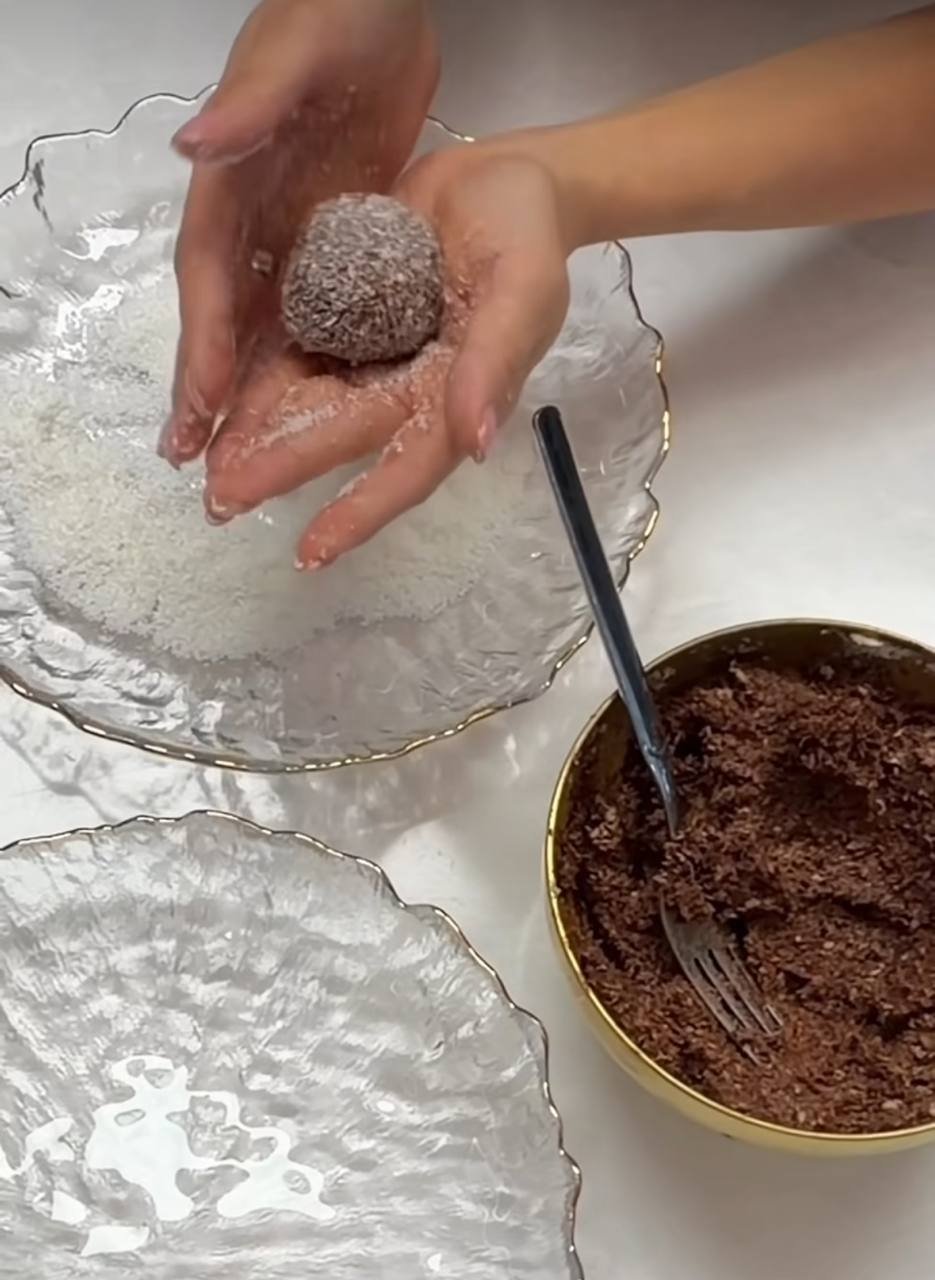 1. В глубокой миске актриса размяла 2 сочных и спелых плодов. Всыпала в массу побольше кокосовой стружки и в конце добавила какао-порошок.