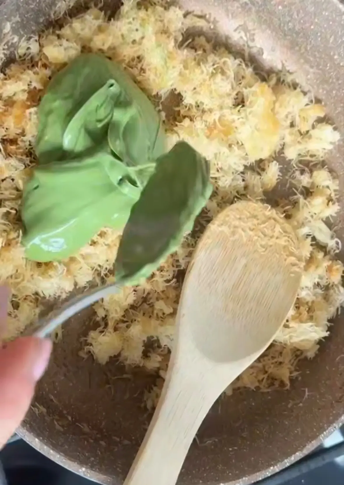 1. Катаифи сначала обжарьте на сковородке с добавлением сливочного масла до хрустящего состояния. Затем вмешайте туда фисташковую пасту, сами орехи и снимите с огня. Дайте полученной массе немного остыть.