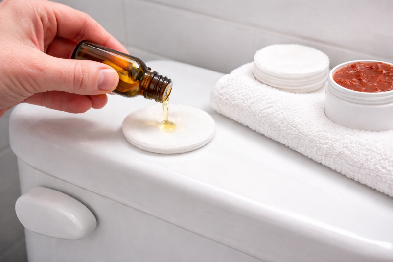 Есть несколько удобных способов применения. Самый простой вариант — капнуть 1–2 капли эфирного масла под ободок унитаза. Там жидкость незаметна и постепенно испаряется, распространяя аромат.