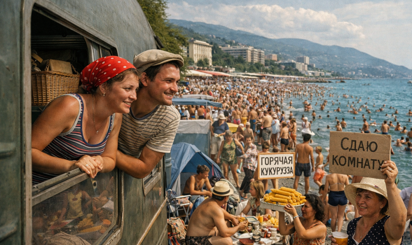 Поездка начиналась с долгой дороги в душных плацкартных вагонах, полных людей с чемоданами и плетеными корзинами с едой. Вагон превращался в настоящий улей, где люди делились своим опытом и поддерживали друг друга в условиях путешествия. Те, у кого были автомобили, ехали на юг на своих "Жигулях" или "Москвичах", что превращалось в настоящее приключение, полное ночёвок в палатках и у родственников.
