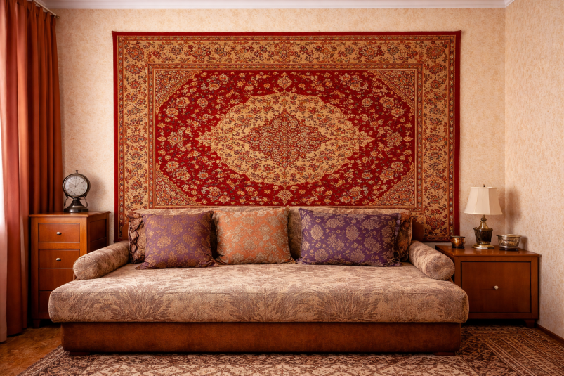 Не менее характерной деталью был ковёр на стене. Он выполнял сразу несколько функций: утеплял помещение, снижал уровень шума и скрывал недостатки отделки. Кроме того, ковёр считался признаком уюта и достатка. Сегодня такие решения практически не используются, уступая место более лёгким и современным материалам.