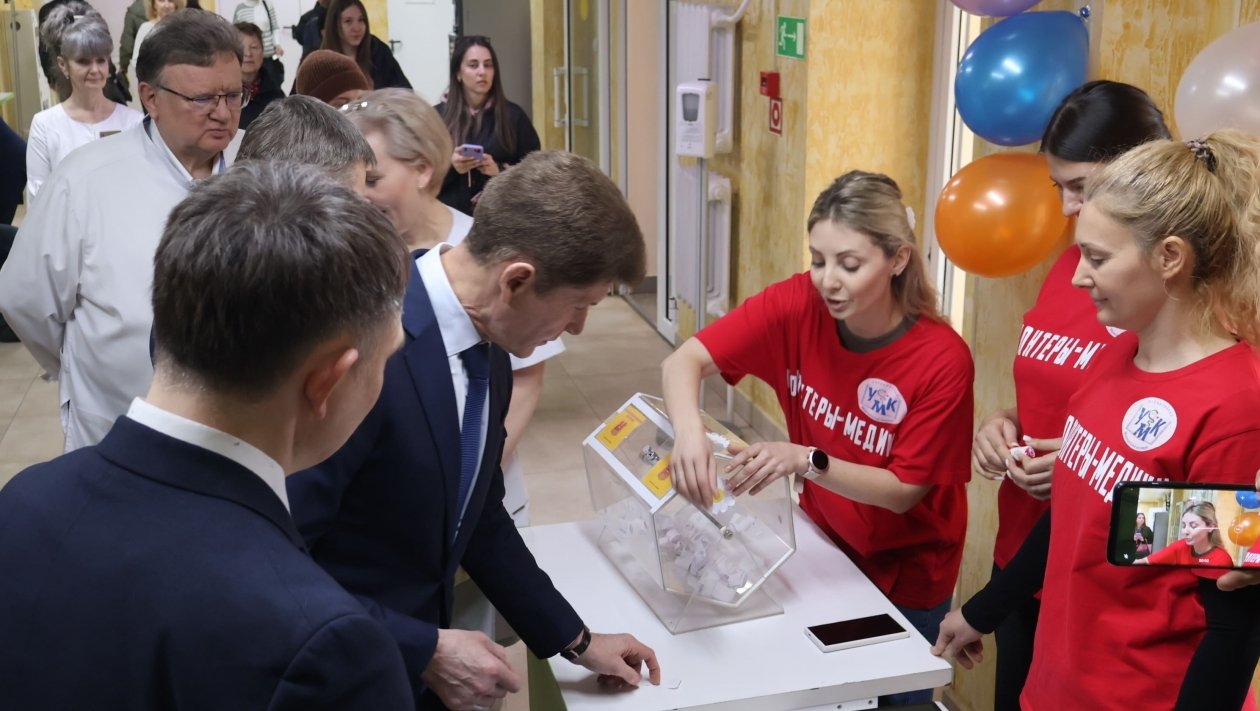 Отсюда начиналась экскурсия для главы региона Олега Кожемяко по медицинскому учреждению. Следом губернатор посетил кабинет рентгена и МРТ и дневной стационар, а также провел встречу с медицинскими работниками.