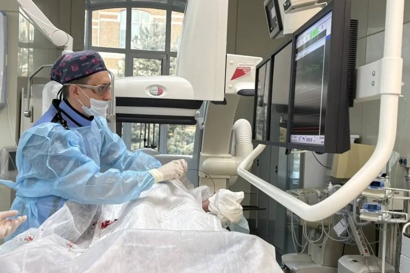 Нейрохирург Михаил Дуболазов и главный специалист Приморья по внутрисосудистой диагностике и лечению Никита Грачев через небольшой прокол в бедренной артерии подвели катетер к сосудам мозга. Врачи установили специальные микроспирали и "закрыли" аневризму, исключив ее из общего кровотока.