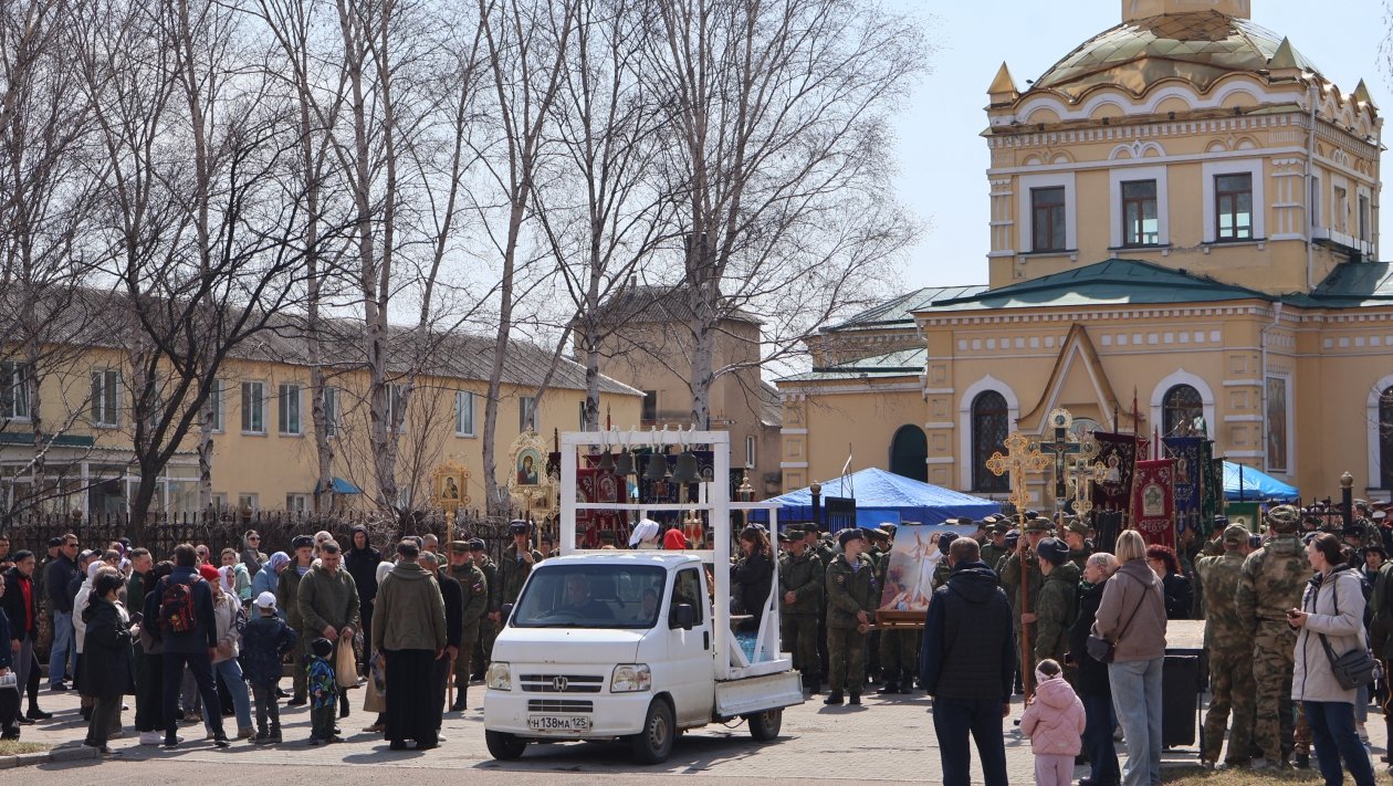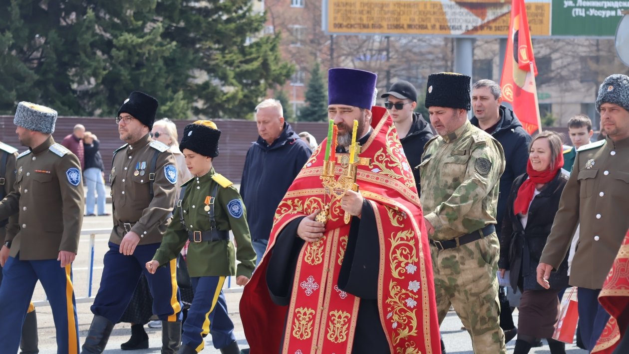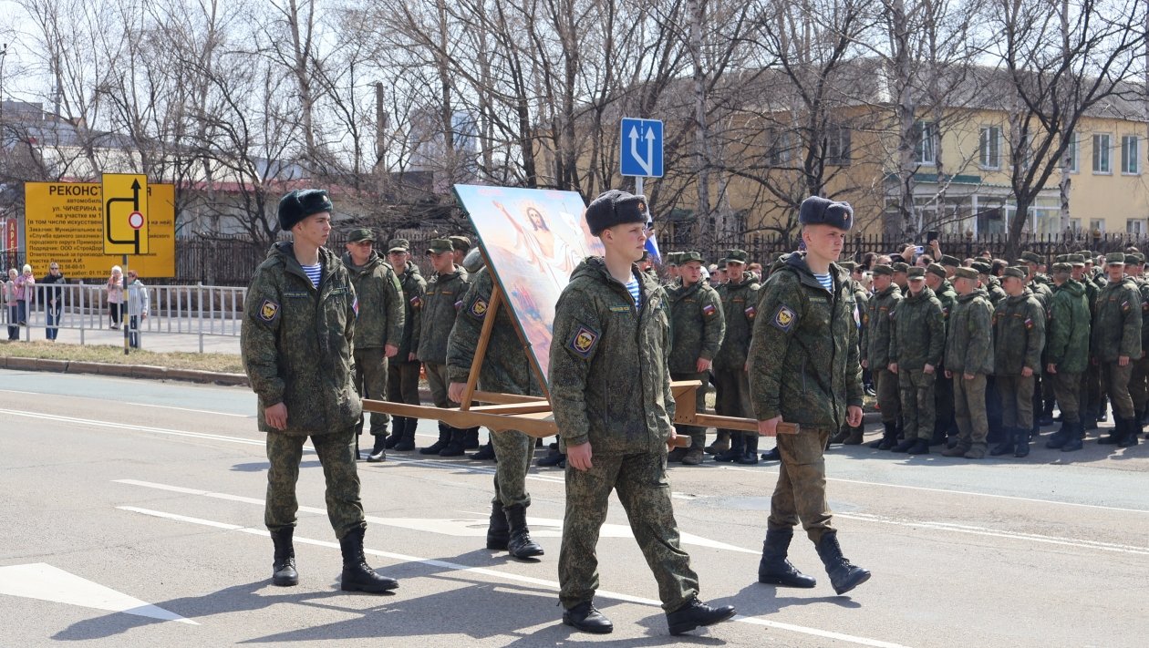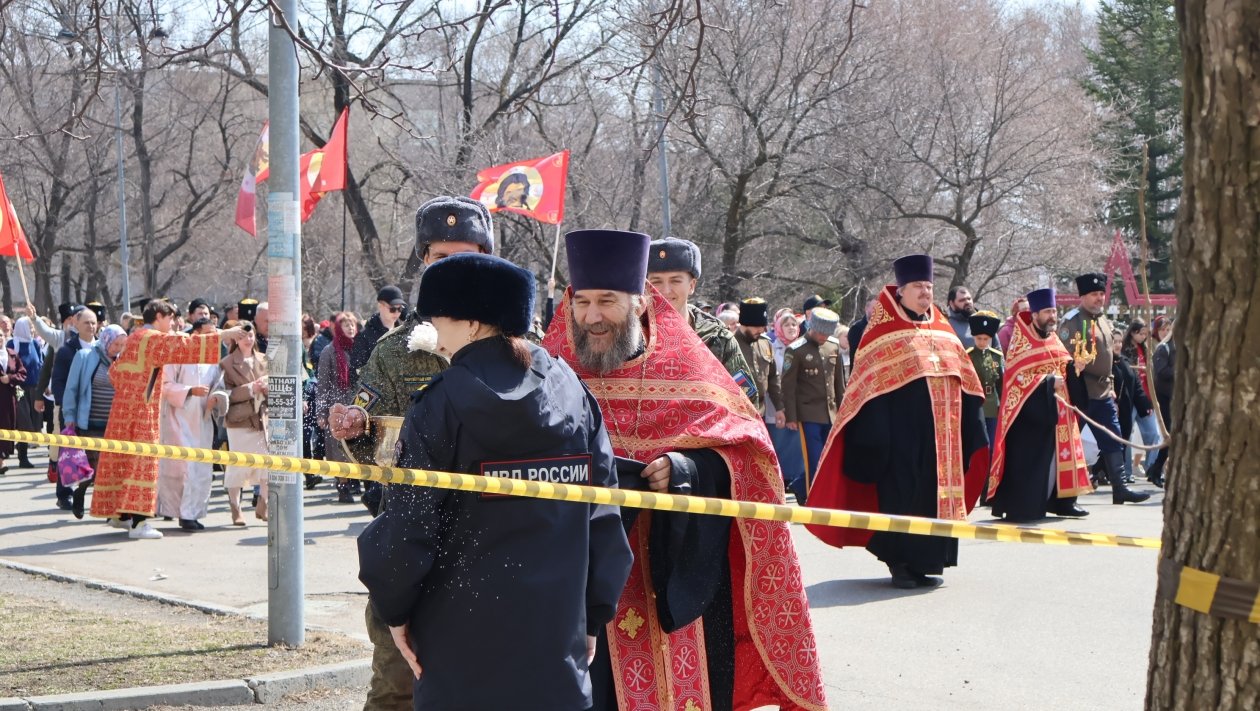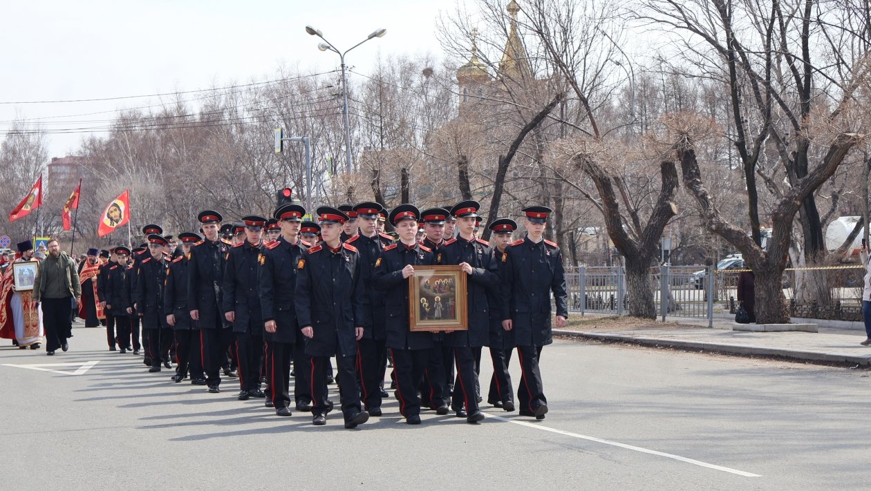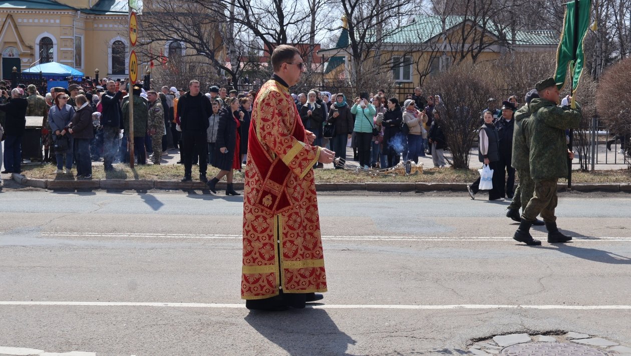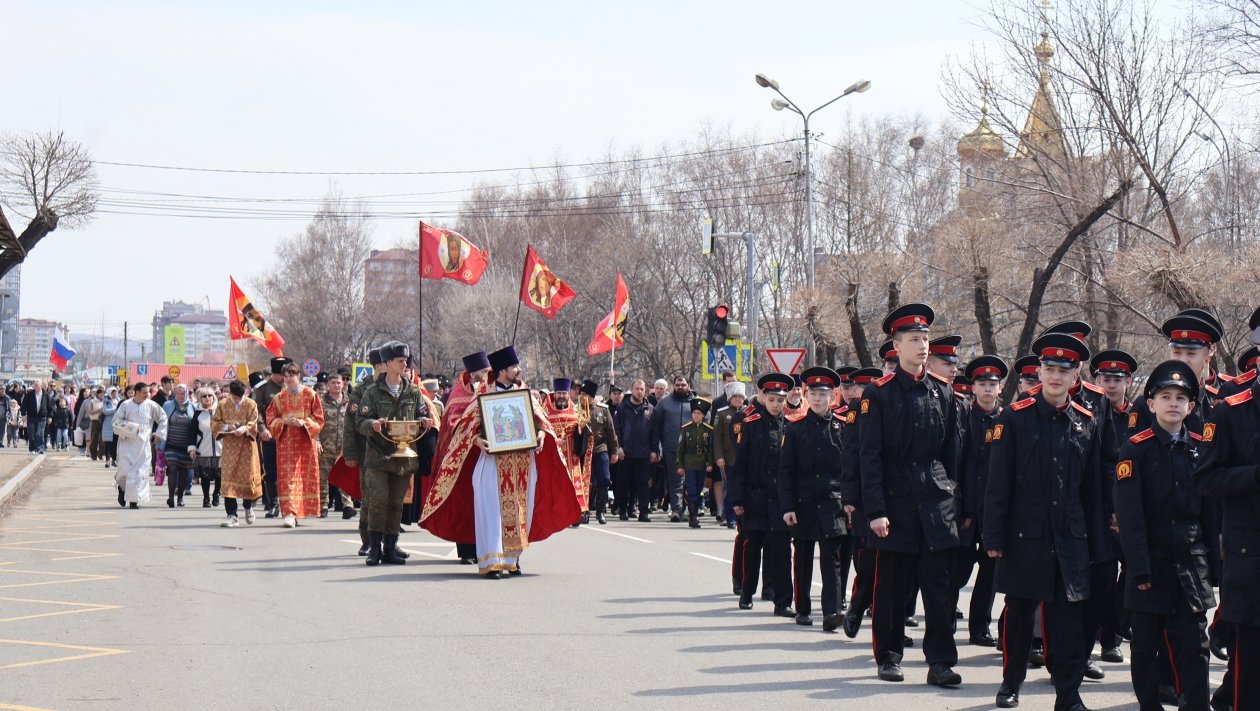 В колонне шли священнослужители, военнослужащие, казаки и прихожане. В крестном ходе приняли участие около 150 военнослужащих Восточного военного округа из частей Уссурийска.