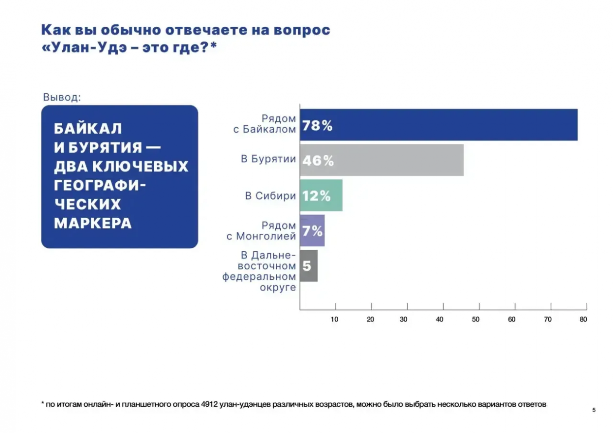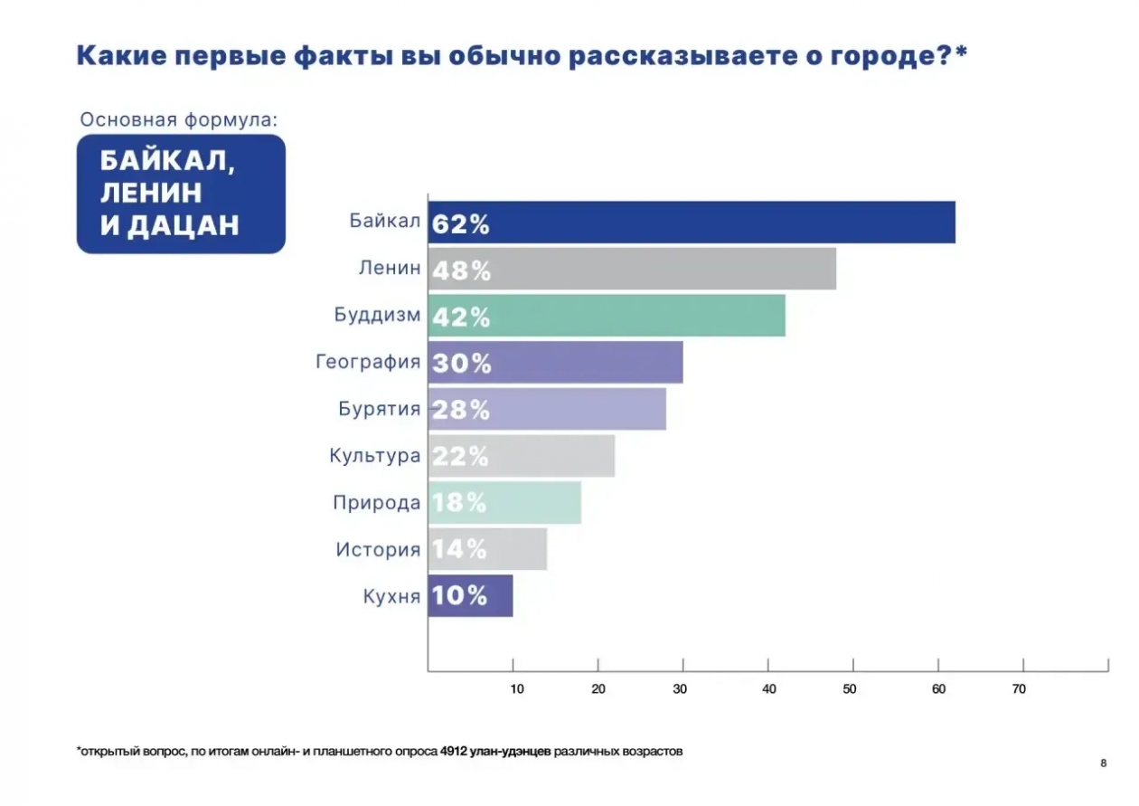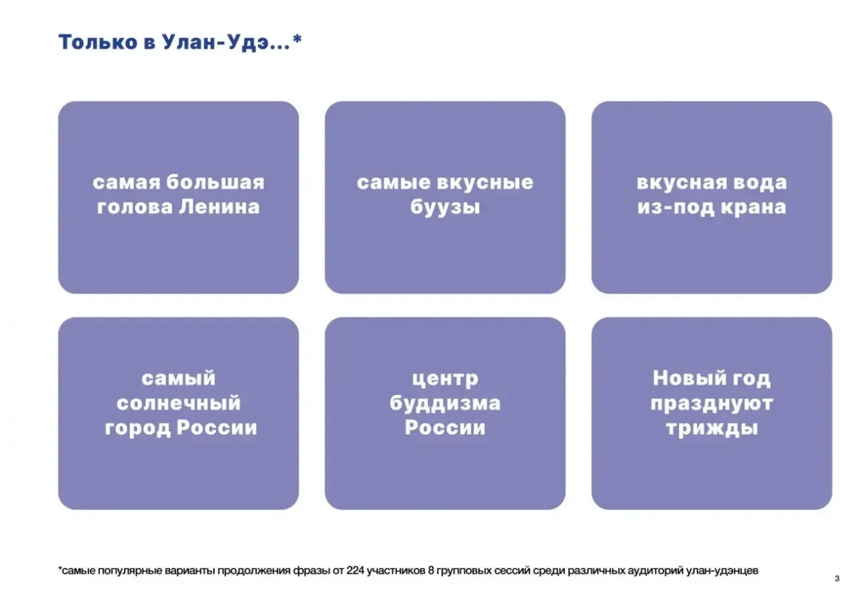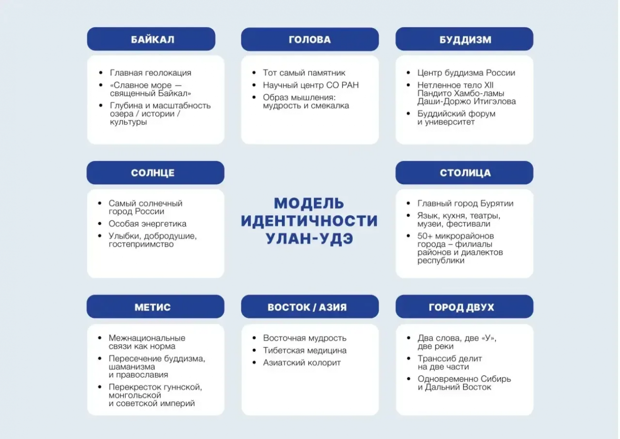 Исследование выделило восемь смысловых блоков, через которые жители видят свой город. Один из центральных — "город двух". "Нам привели много примеров, когда можно город позиционировать через две части чего-то или через двойственность. Понятно: два слова в названии города, что достаточно редко встречается. Две "У". Две реки. Трансиб делит город на две части. Одновременно здесь и Сибирь, и Дальний Восток. Или если мы говорим про что-то сакральное или эзотерическое: есть душа и тело, есть Инь и Ян", — объяснил на онлайн-пресс-конференции руководитель разработки бренда Василий Дубейковский.
