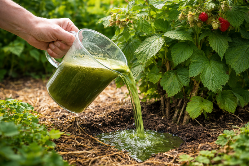 Следующий этап — органическая подкормка. Вместо навоза всё чаще применяют настой из трав, который дачники называют "зелёным квасом". Для его приготовления подходят крапива, одуванчики и другие сорные растения без семян. Сырьё заливают водой и оставляют на несколько дней для брожения. Перед использованием настой разбавляют и поливают кусты под корень.