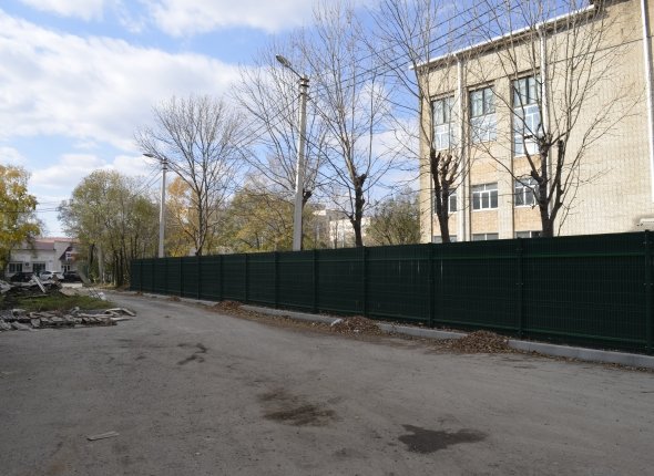 Особое беспокойство вызвала конструкция забора, установленного у главного входа в здание будущей школы и граничащего с территорией ремонтируемого корпуса бывшего биофака УГПИ. По проекту подрядчик установил 3D-забор из сетки, сейчас к ограждению прикручены листы профнастила.