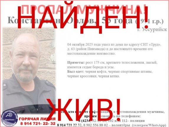 Завершены поиски пропавшего 53-летнего жителя Уссурийска. Мужчина покинул дачу в районе Пивзавода 4 октября и до 2 марта о его местонахождении ничего не было известно. Пропавший найден живым, сообщается в Tg-канале (18+) ПРОО "ПримПоиск".