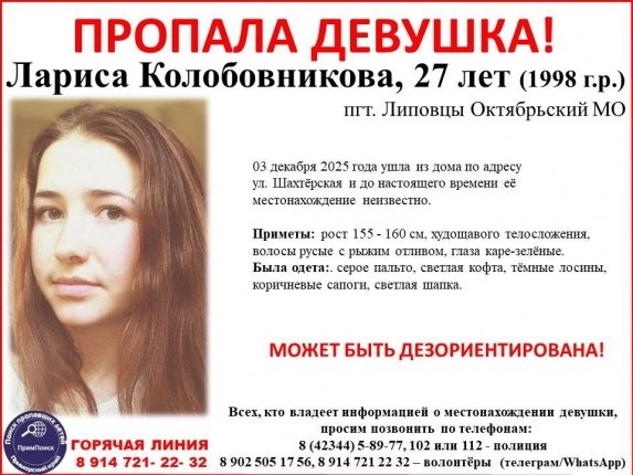 UssurMedia, 7 декабря. В Приморье объявлены поиски 27-летней Ларисы Колобовниковой из пгт. Липовцы Октябрьского муниципального округа. 3 декабря девушка ушла из дома по улице Шахтерской и до настоящего времени ее местонахождение не известно, сообщает тг-канал (18+) ПРОО "ПримПоиск".