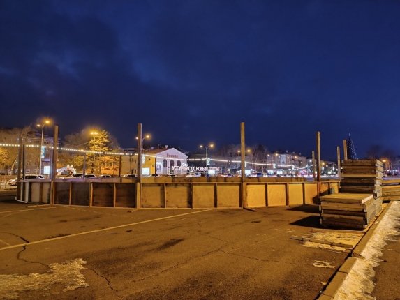 Рабочие установили деревянные конструкции, которые в скором времени станут бортиками для детского катка. Осталось окончательно закрыть деревянную основу баннерами в фирменном сказочном стиле 2026 года. Рядом аккуратными штабелями уложены будущие бортики катка для взрослых ценителей побороздить ледовое поле острым коньком.