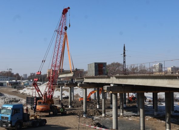Сейчас, по словам производителя работ Дениса Малкова, идет установка балок четвертого пролета, после которого останется еще два пролета и 26 балок.