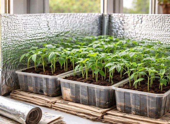 Важно, что матовая сторона фольги рассеивает свет, а не даёт точечные блики. Это снижает вытягивание рассады и способствует формированию более толстого стебля.